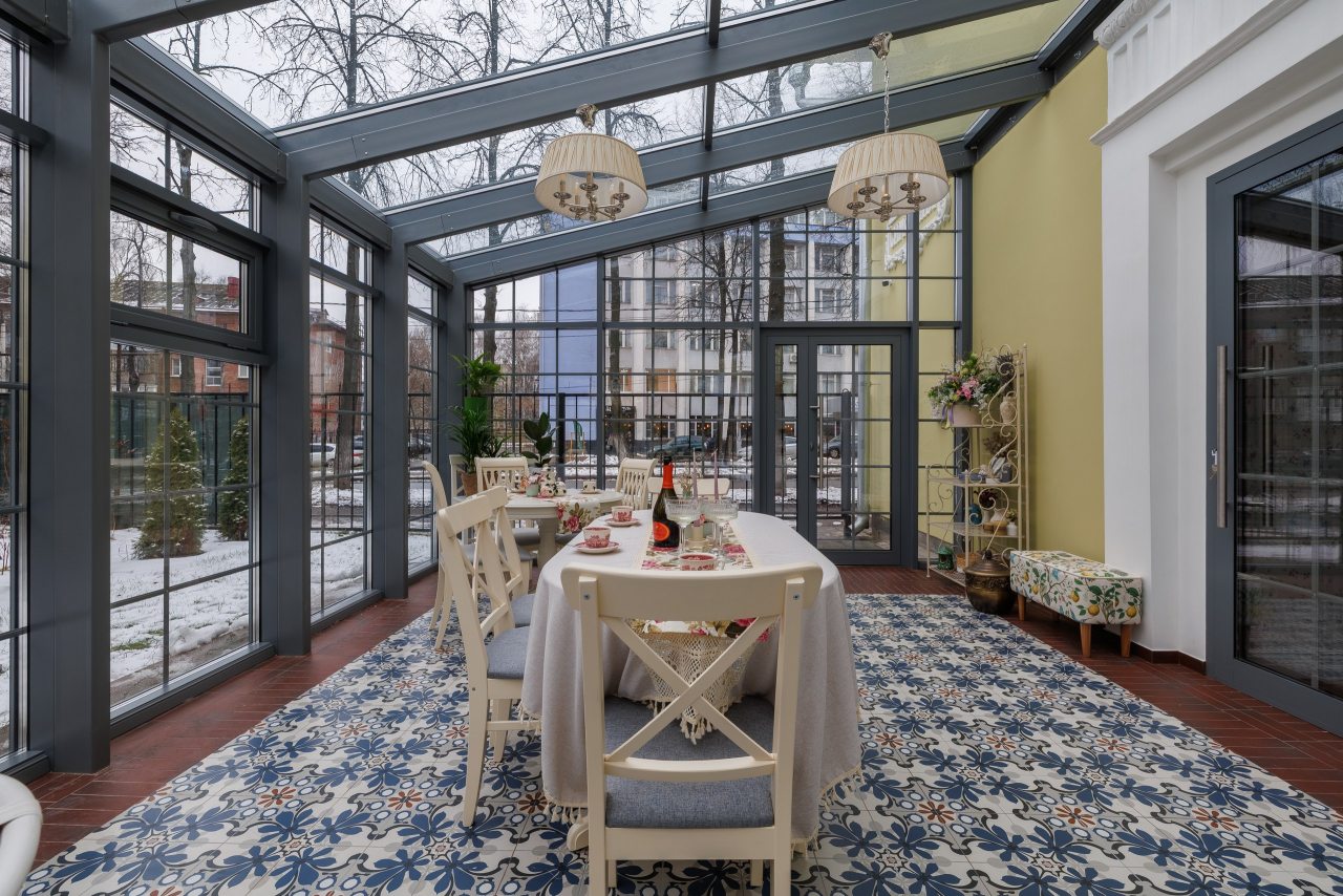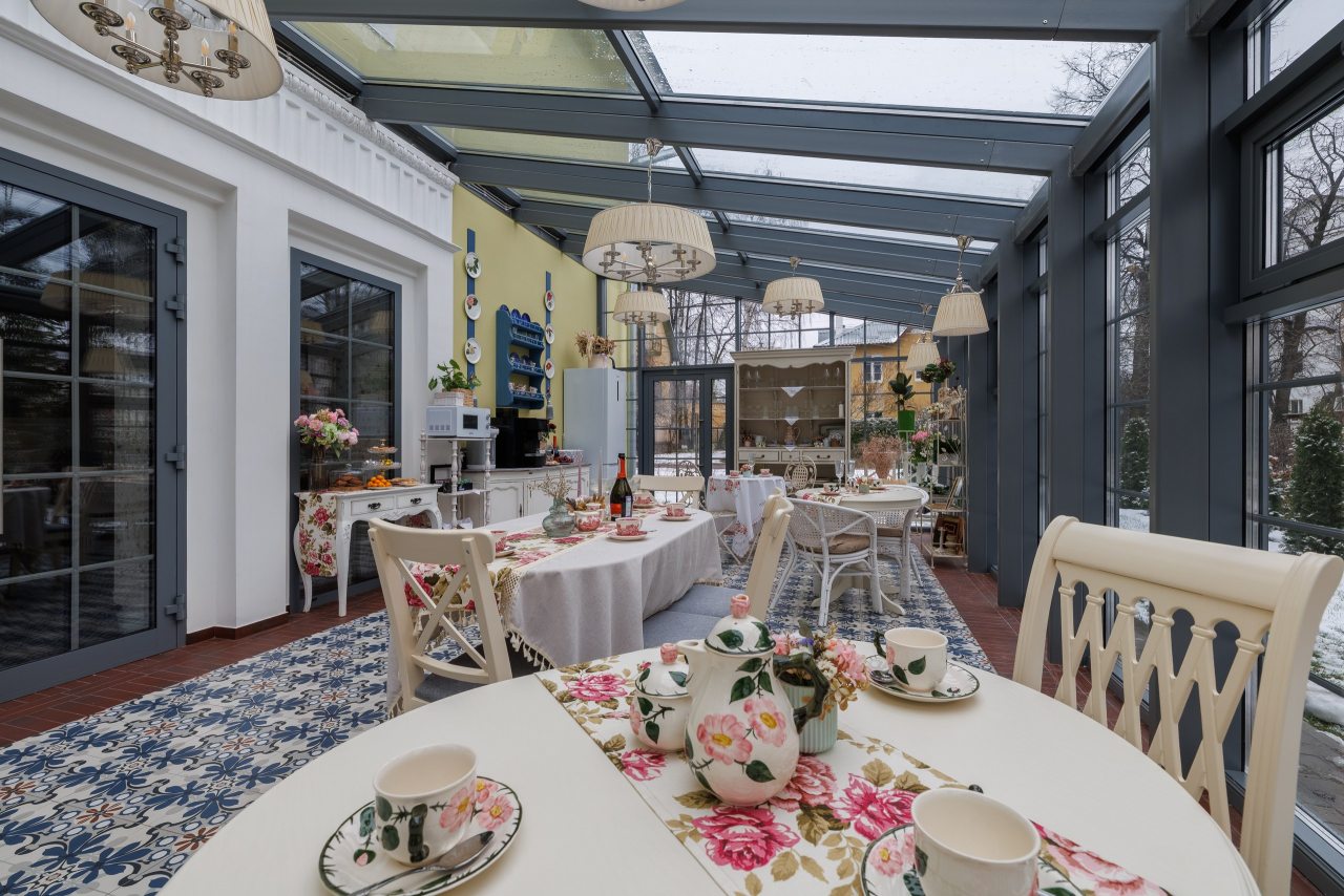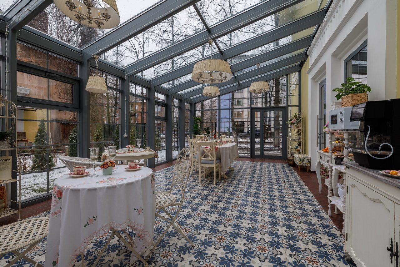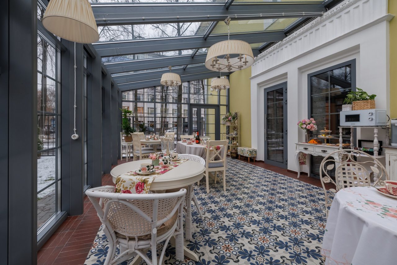 Также на территории отеля предусмотрена красивая веранда с панорамным остеклением. Здесь вы можете воспользоваться чайником, кофемашиной, посудой и микроволновой печью.