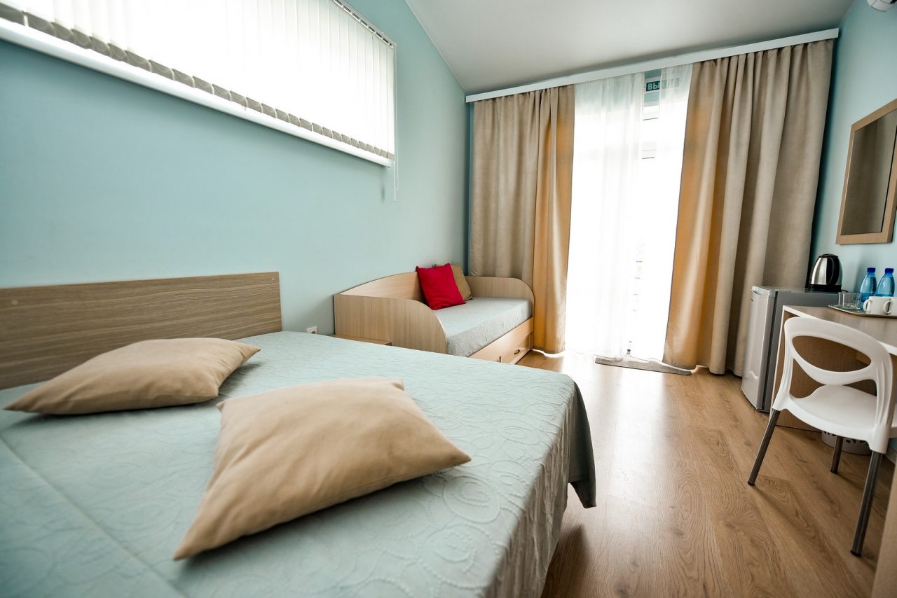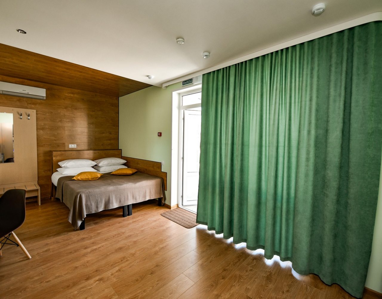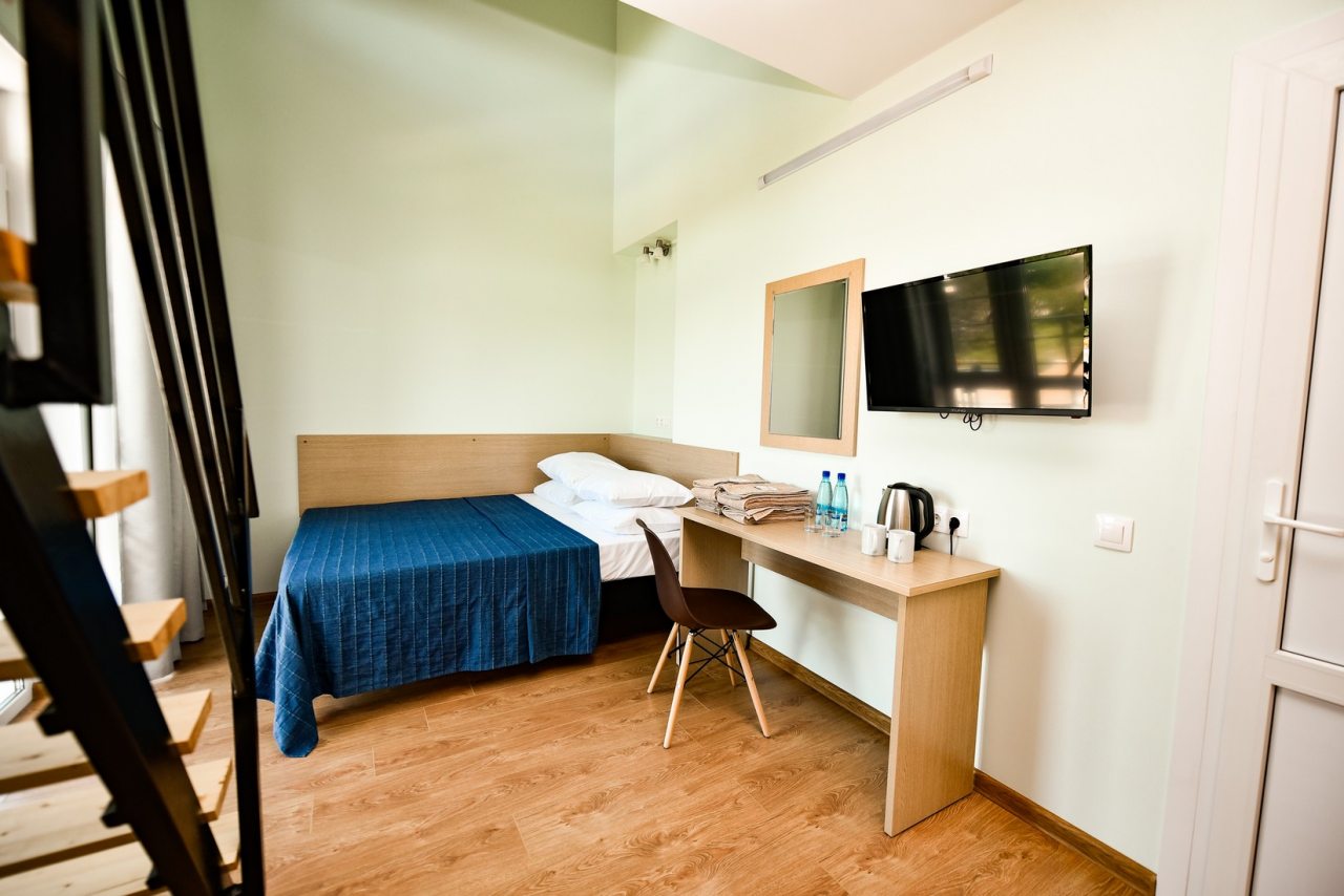 Для гостей предлагаются уютные номера оборудованные всей необходимой мебелью и техникой для качественного проживания, например: комфортабельными спальными местами с комплектом постельного белья, прикроватной мебелью, шторами для максимально комфортного сна, кондиционером, чайником и шкафом для хранения личных вещей. Санузел укомплектован сантехникой и набором полотенец.