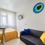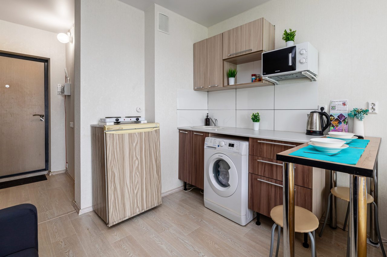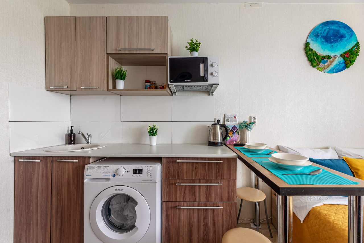 На компактной кухне есть плита, мини-холодильник, чайник, СВЧ-печь, посуда, чтобы вы могли радовать себя любимой едой в любое время.