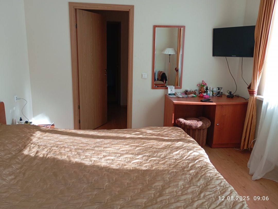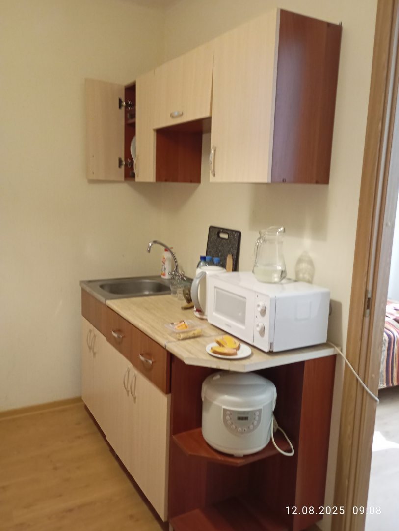 Из недостатков: очень маленькая душевая кабинка,мы не крупные и то постоянно стукались локтями,не развернешься.Можно добавить стульев.Номер четырехместный,двухкомнатный,а в наличии всего было банкетка,нормальный стул и два пластиковых стула у которого сломана спинка и второй вот вот развалиться. Чтобы поесть на кухне или балконе,постоянно таскали стулья туда сюда.Номер огромный и когда на улице прохладно в нем холодно.Берите с собой теплые тапки,пол ледяной.Без машины до центра города пешком минут 40 -50, а с такси проблемы.