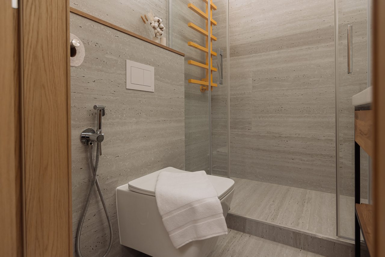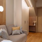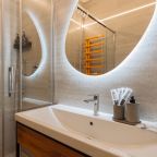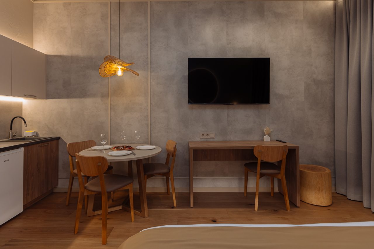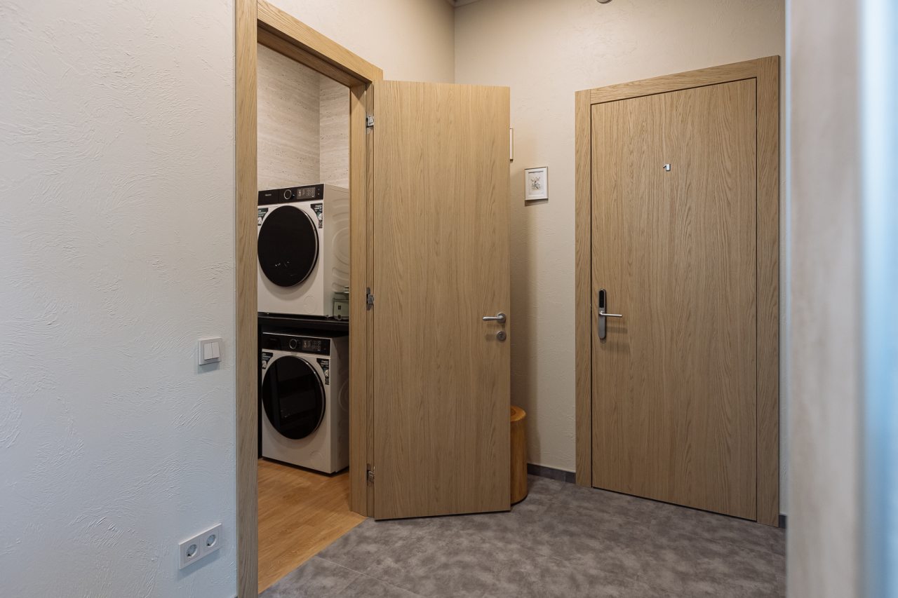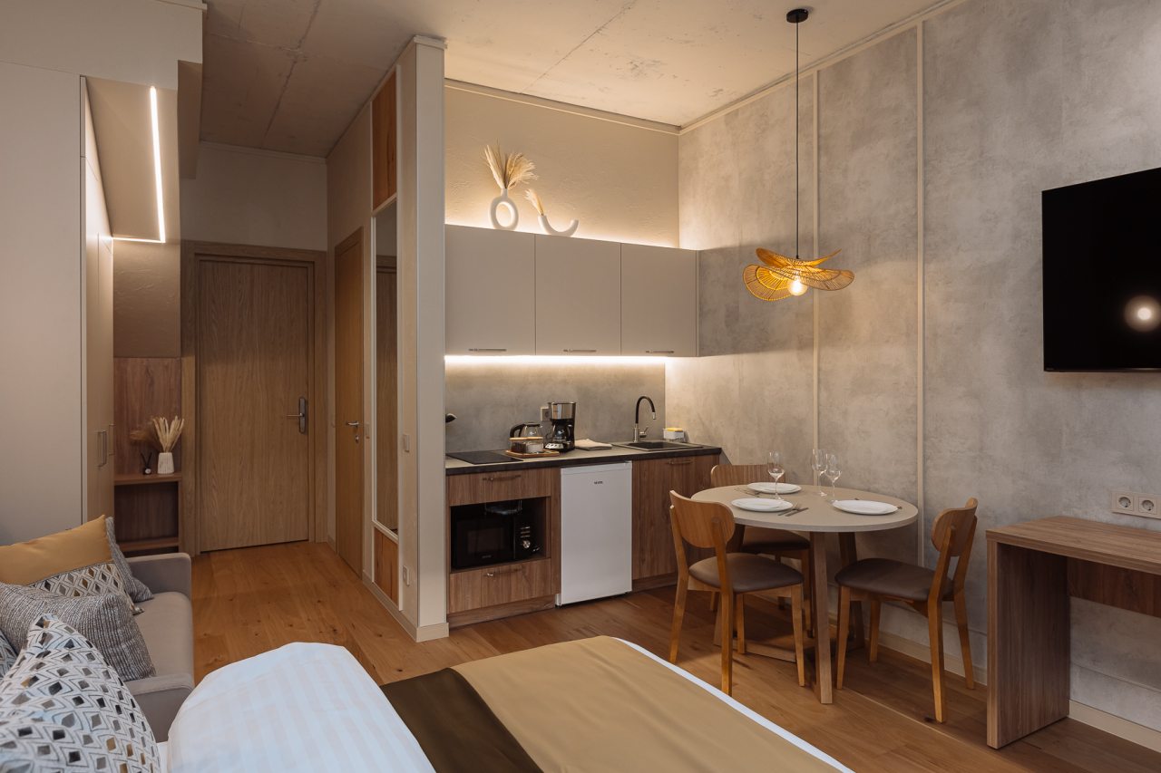 Уютные апартаменты с современным ремонтом оснащены двуспальной кроватью, диваном, шкафом, телевизором, высокоскоростным интернетом, затемненными шторами, гладильными принадлежностями и др. Санузел укомплектован необходимой сантехникой, средствами личной гигиены, гигиеническим душем, стиральной машиной.