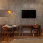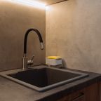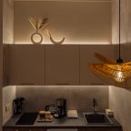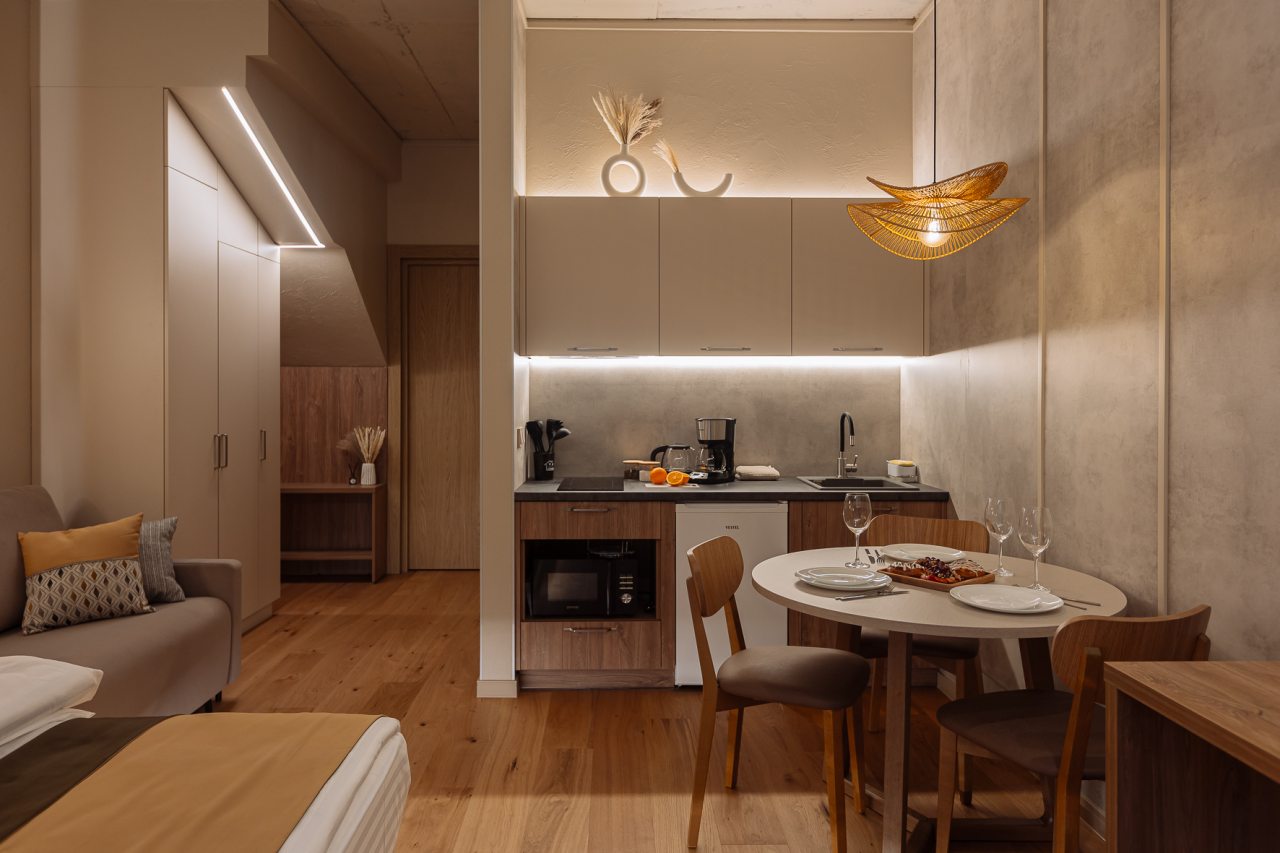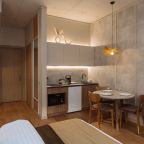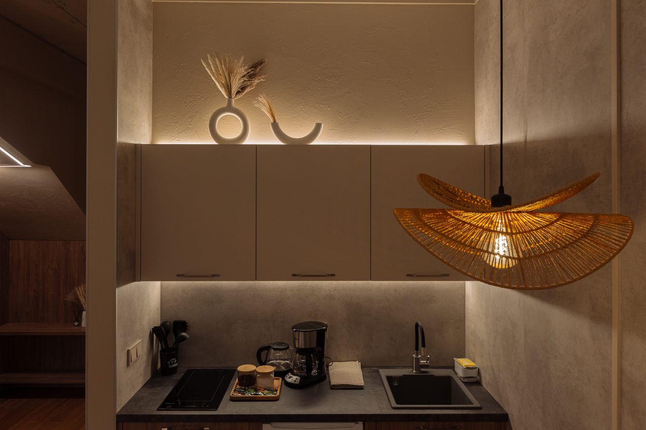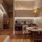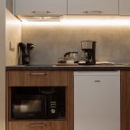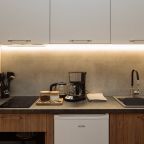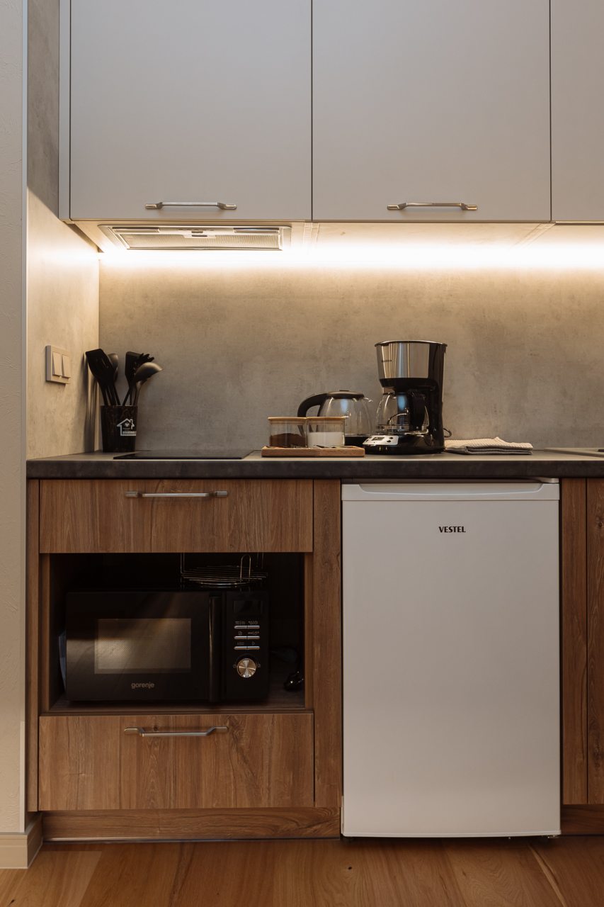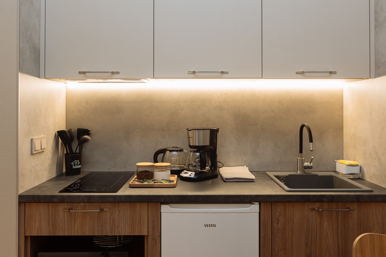 Стильная кухня оборудована холодильником, кофемашиной, микроволновой печью, варочной панелью, чайником, набором посуды и обеденным столом. В доступности кондитерская, пиццерия и продуктовый магазин.