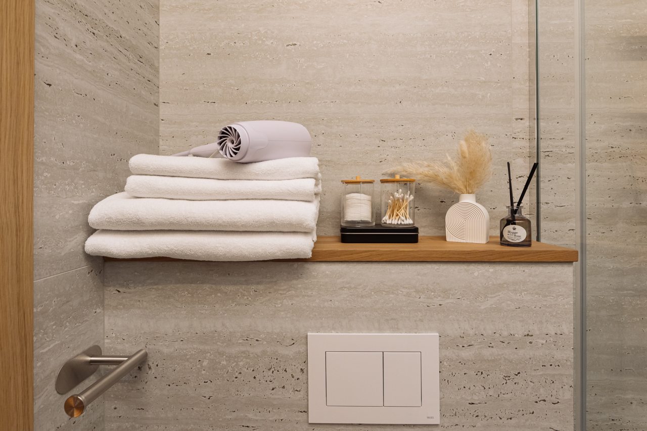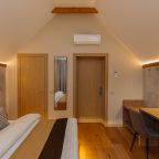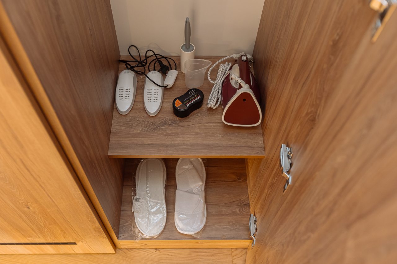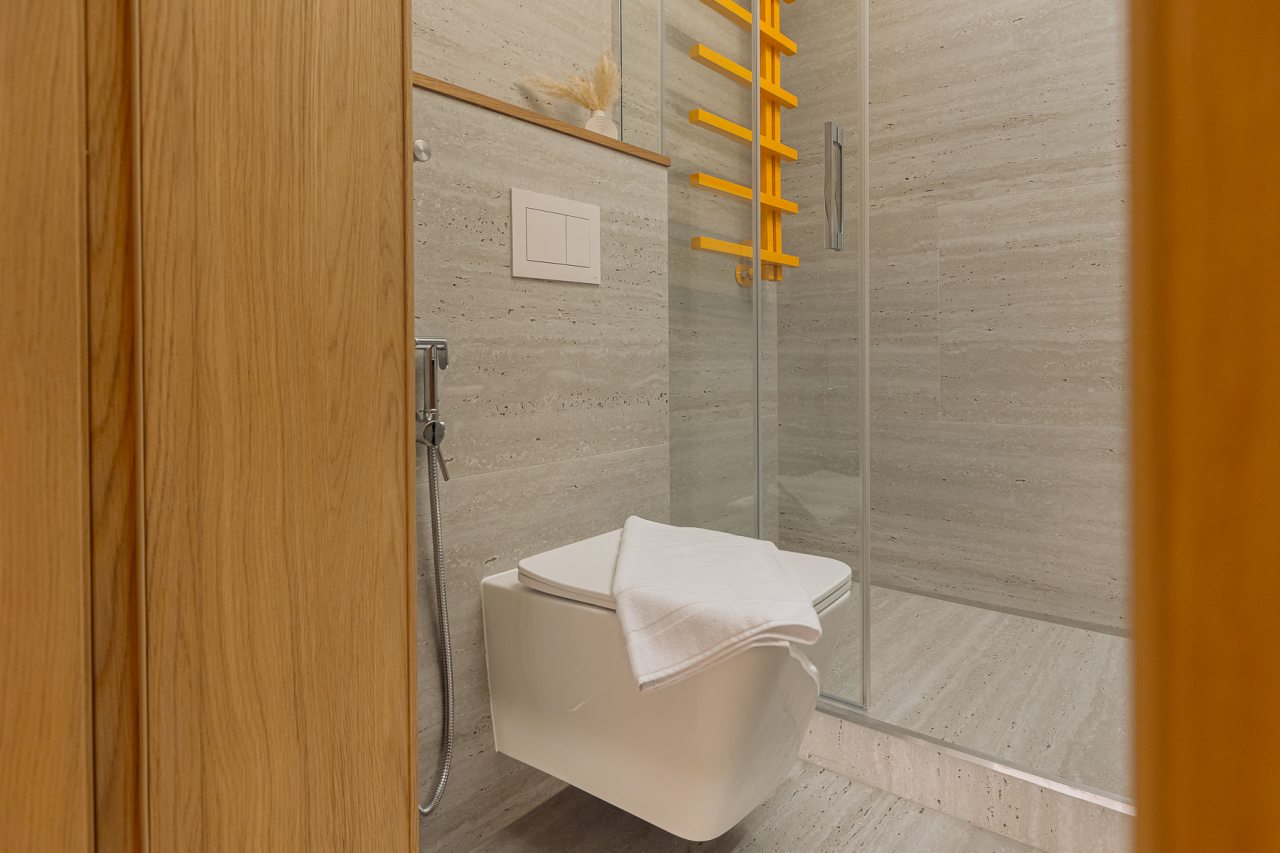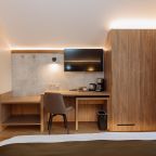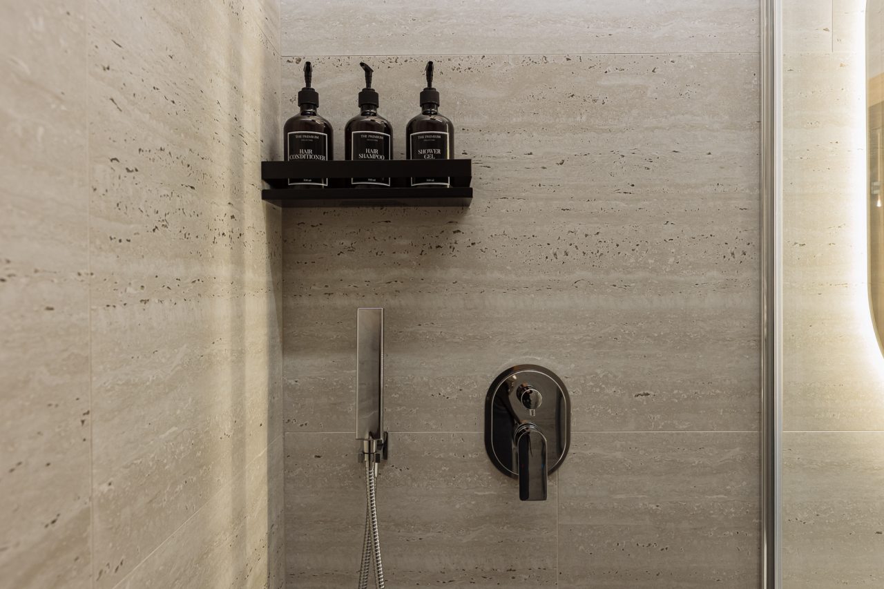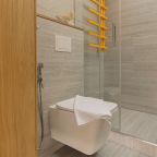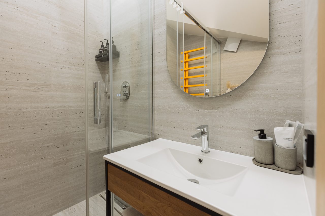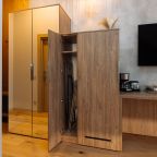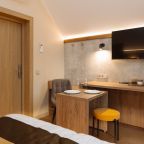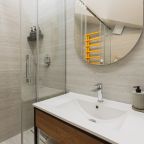 Апартаменты оформлены в приятных бежевых тонах и современном стиле интерьера. Они укомплектованы мебелью и техникой, необходимой для времяпровождения и отдыха: двуспальная кровать с удобным матрасом, кондиционер, телевизор с плоским экраном, рабочий стол, вместительный шкаф и зеркало. Ванная комната оснащена гигиеническими средствами и набором полотенец.
