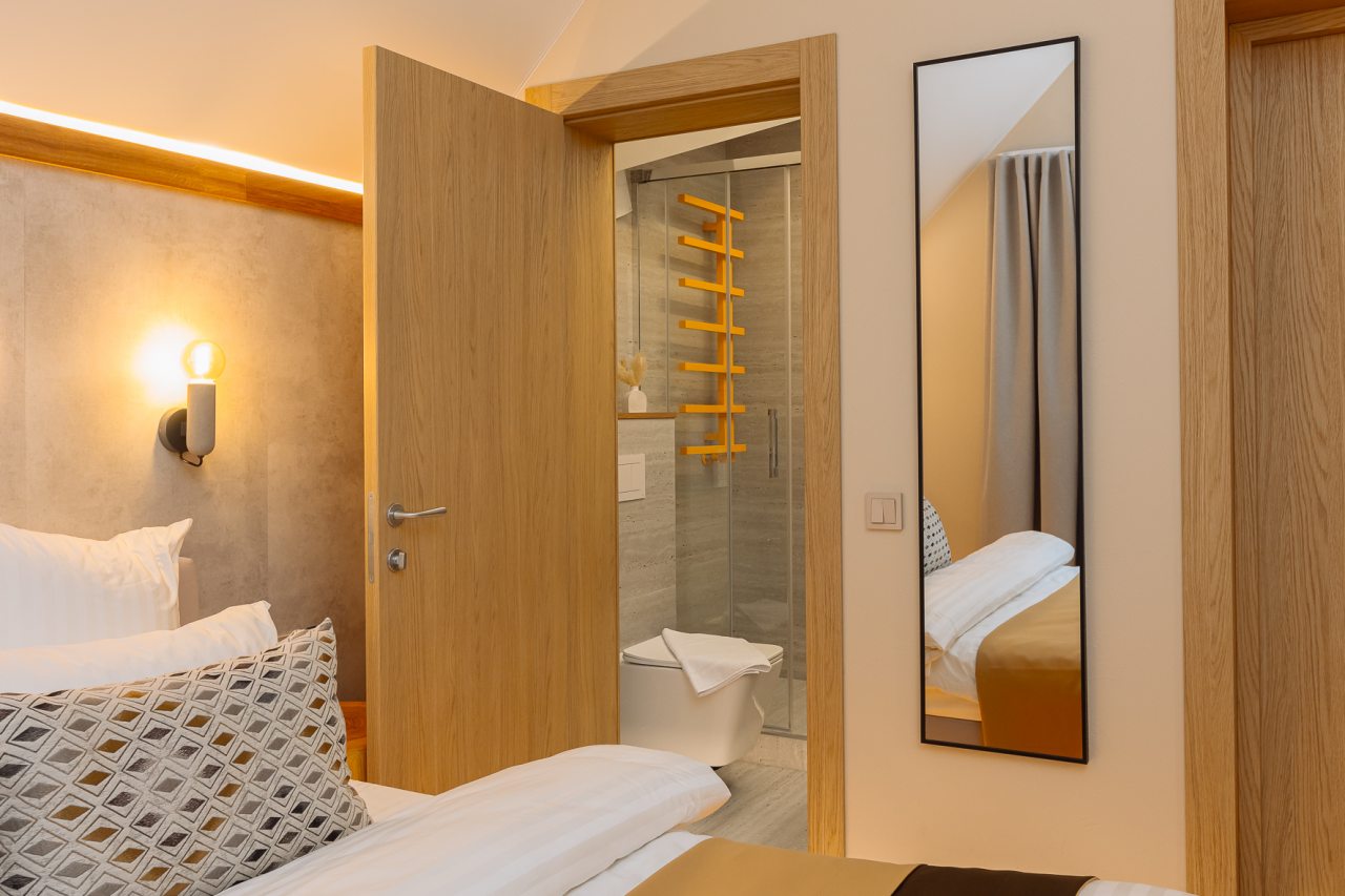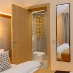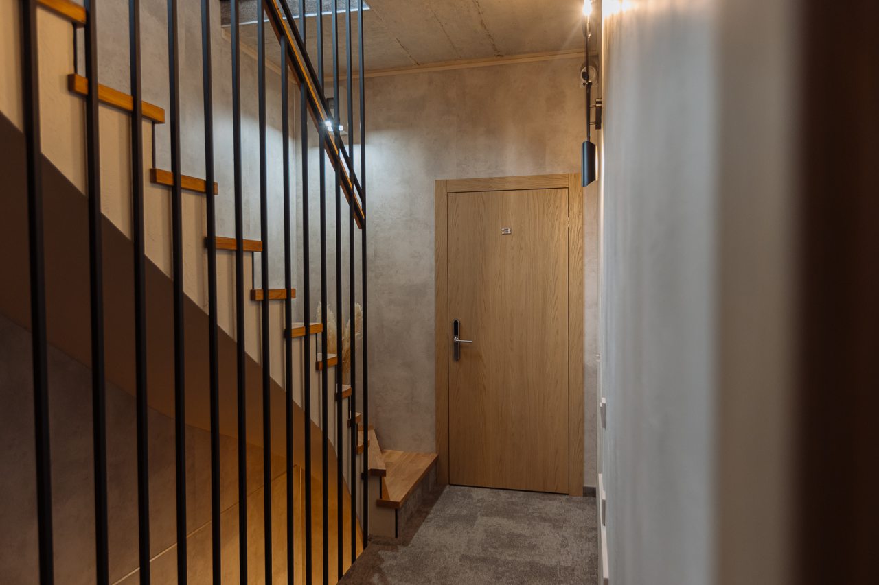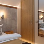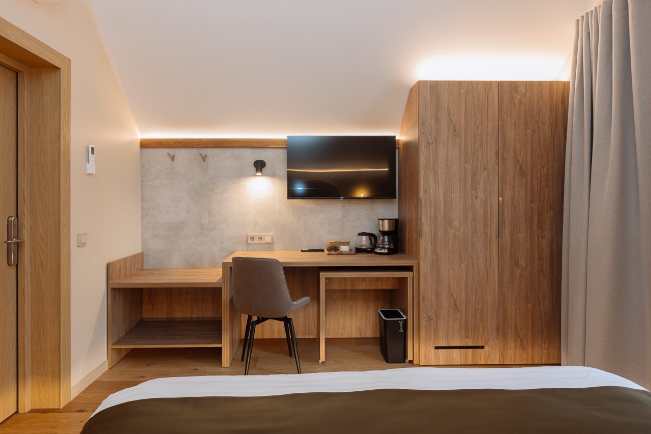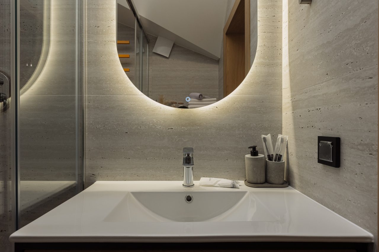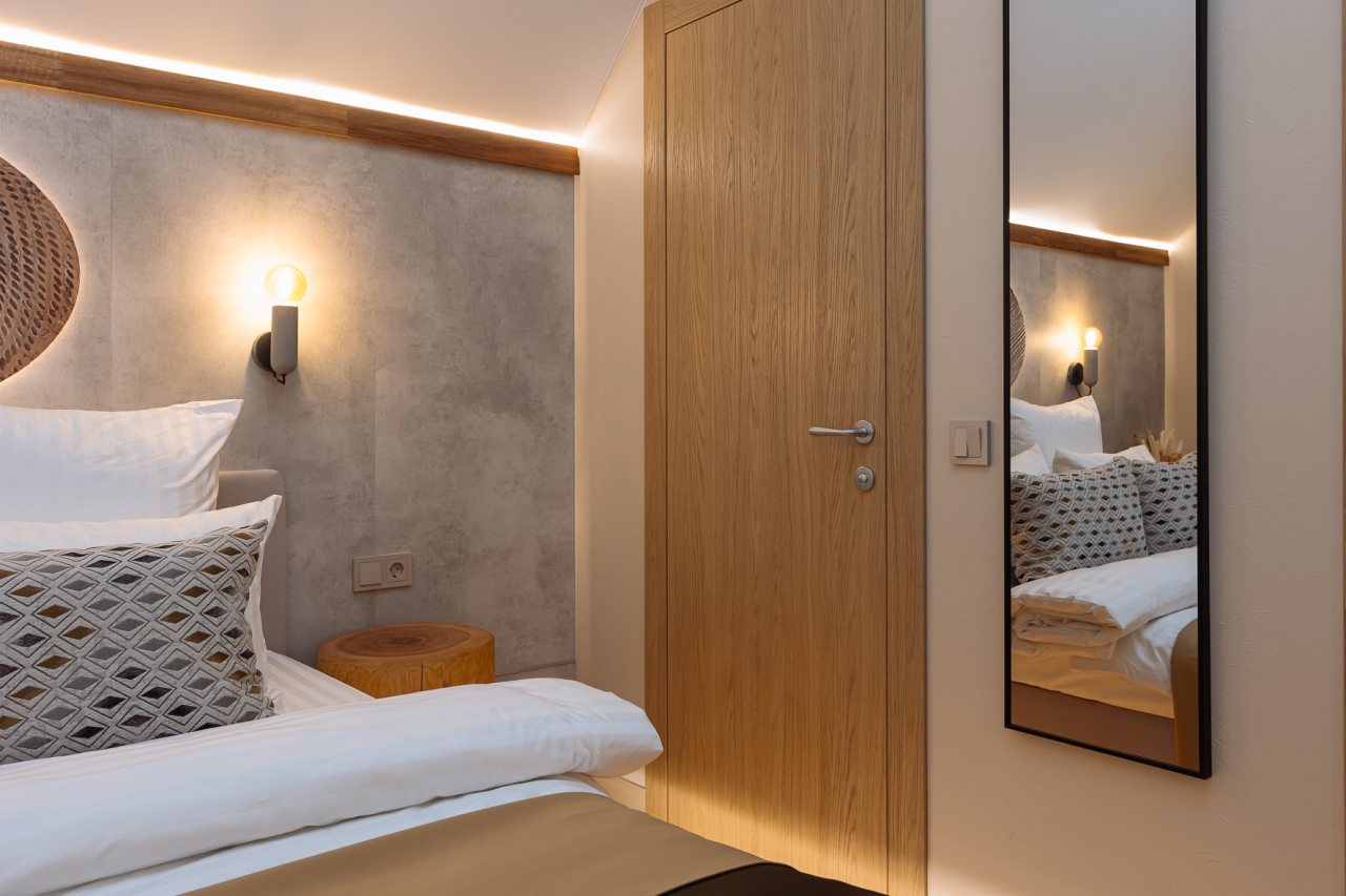 Апартаменты оформлены в приятных бежевых тонах и современном стиле интерьера. Они укомплектованы мебелью и техникой, необходимой для времяпровождения и отдыха: двуспальная кровать с удобным матрасом, кондиционер, телевизор с плоским экраном, рабочий стол, вместительный шкаф и зеркало. Ванная комната оснащена гигиеническими средствами и набором полотенец.