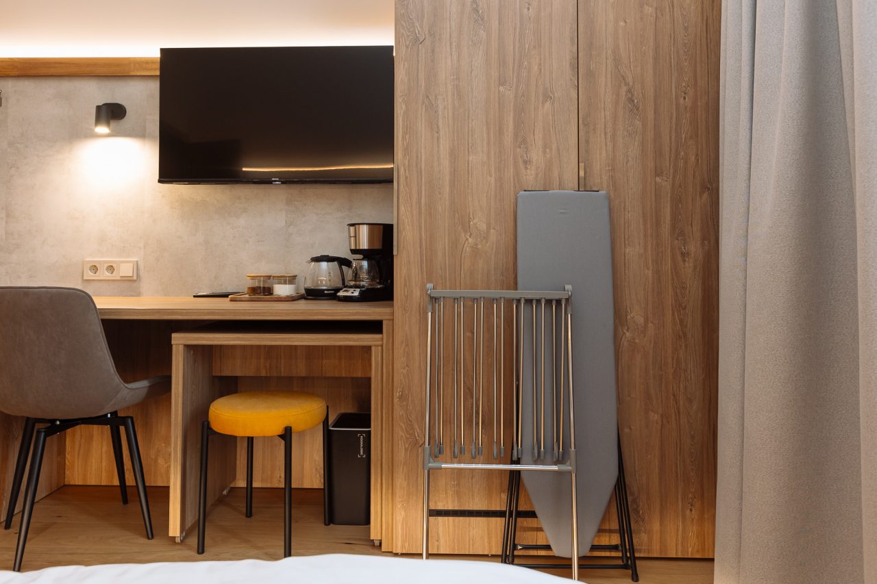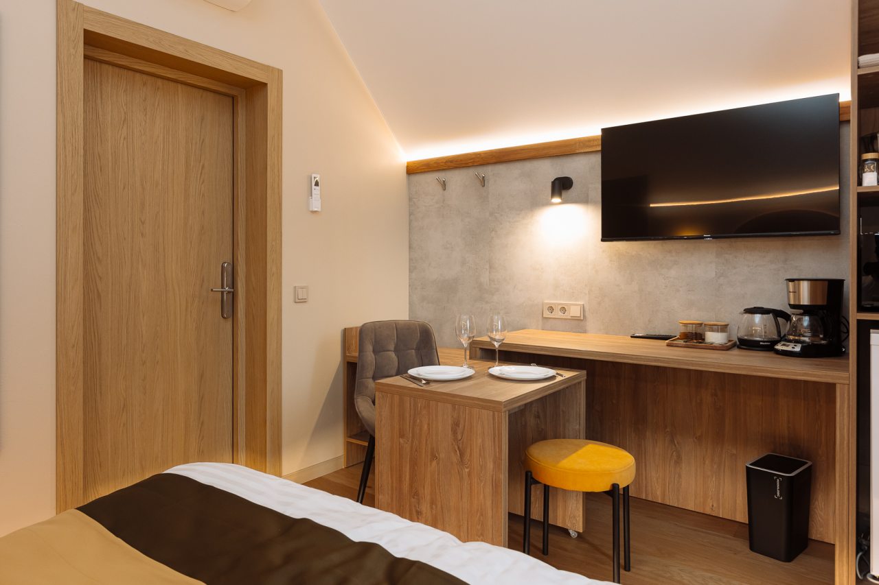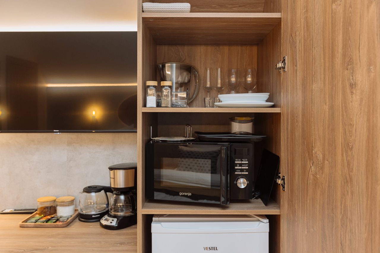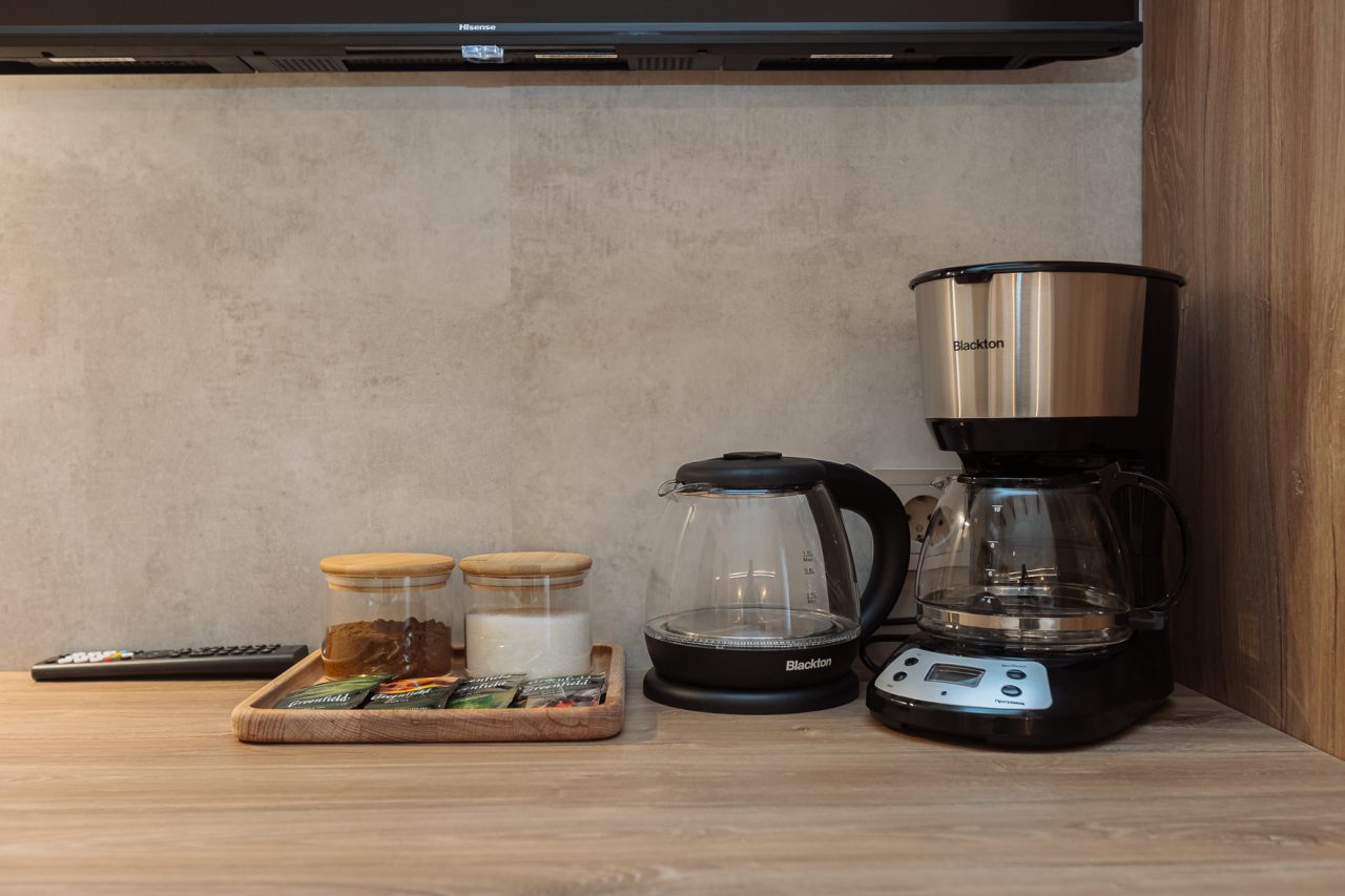 Для организаций чаепитий и легких перекусов предусмотрена кофеварка и чайная станция. В шаговой доступности работает магазин продуктов и кофейня с десертами.