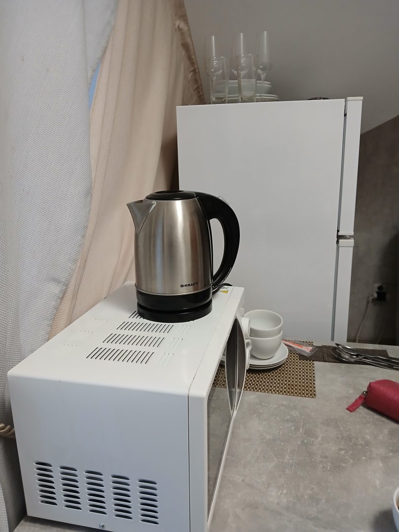 Обеденная зона оснащена холодильником, микроволновой печью, набором посуды, электрическим чайником, плитой.