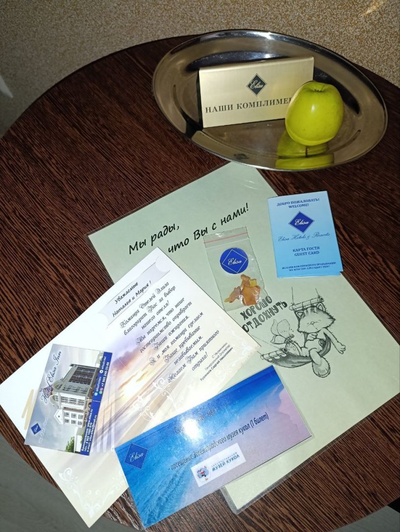 Сразу подкупают комплименты, которыми вас здесь встречают и провожают. Мелочь, а приятно: приветственные именные открытки, магниты, беспроигрышная лотерея - мы выиграли билет в музей кукол, россыпь янтаря, яблоки и круассаны. С дороги или перед самолётом это не лишнее.