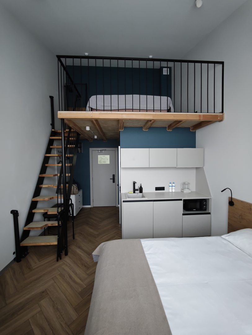 Бронировали по акции — прекрасное соотношение ценыкачества. Отель рядом с вокзалом, внутри ТЦ, но не шумно, в том же здании Spar. Номер двухуровневый, в нем было две двуспальные кровати. Всё довольно новое, чистое, есть мини-кухня, чайник, посуда, плитка