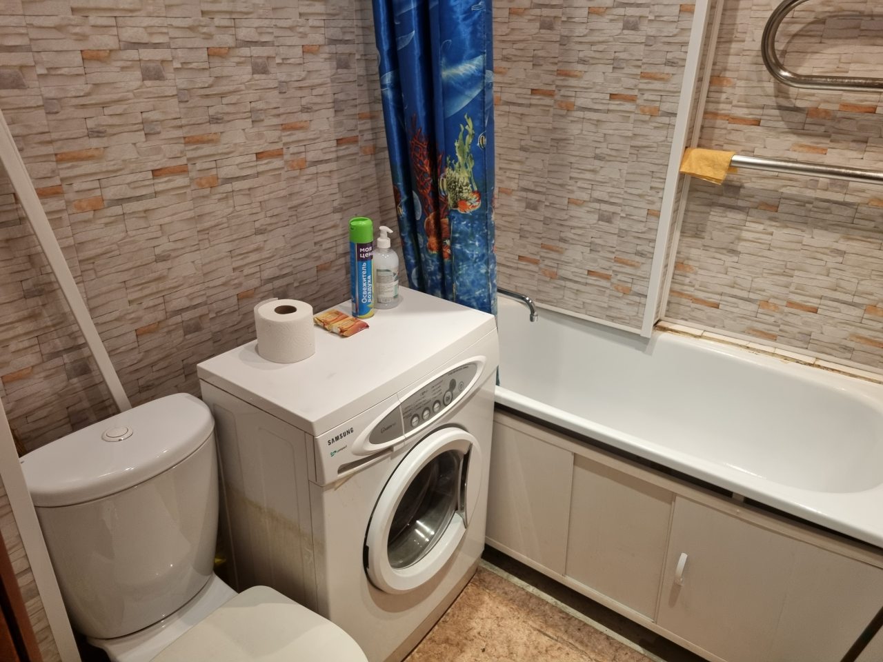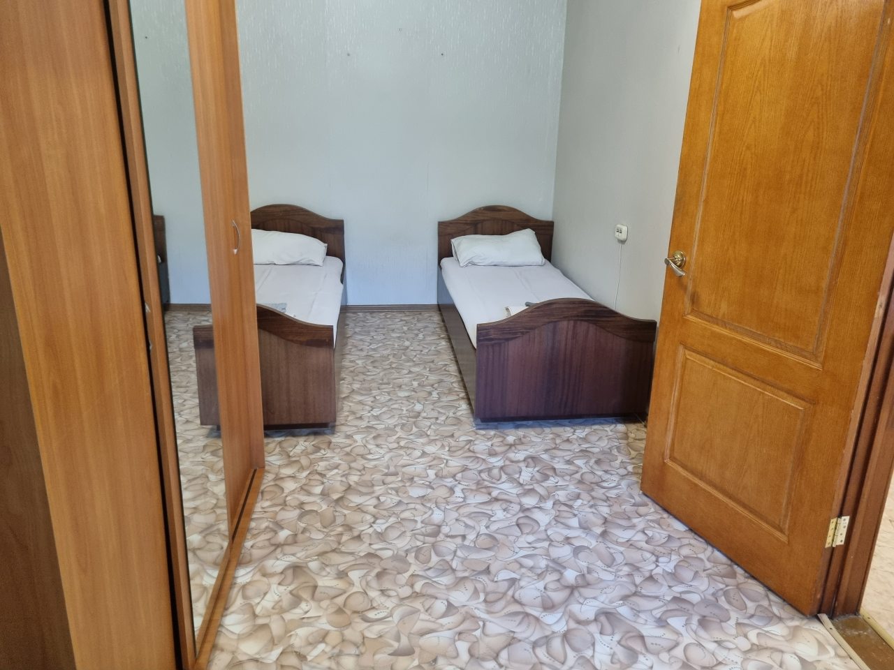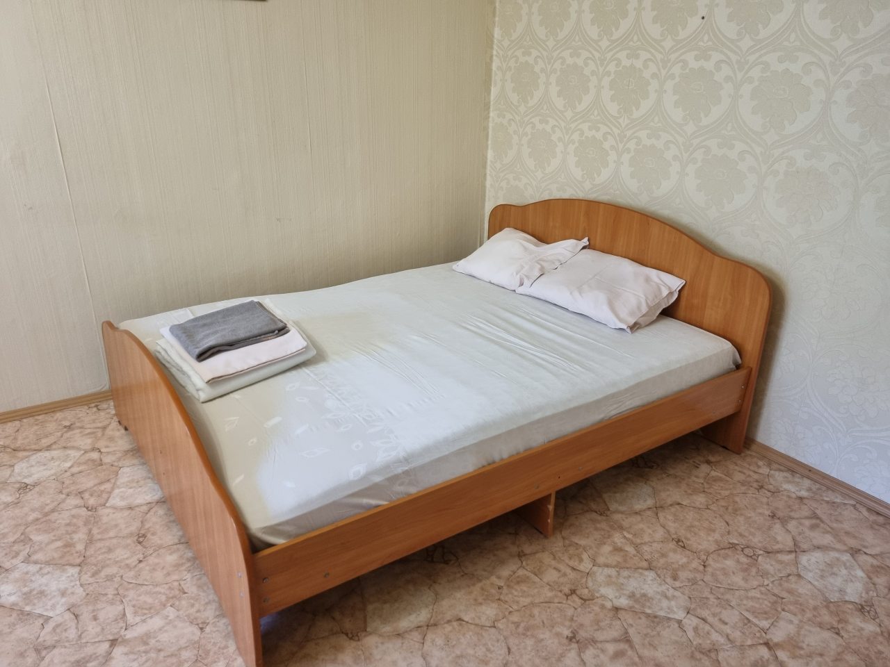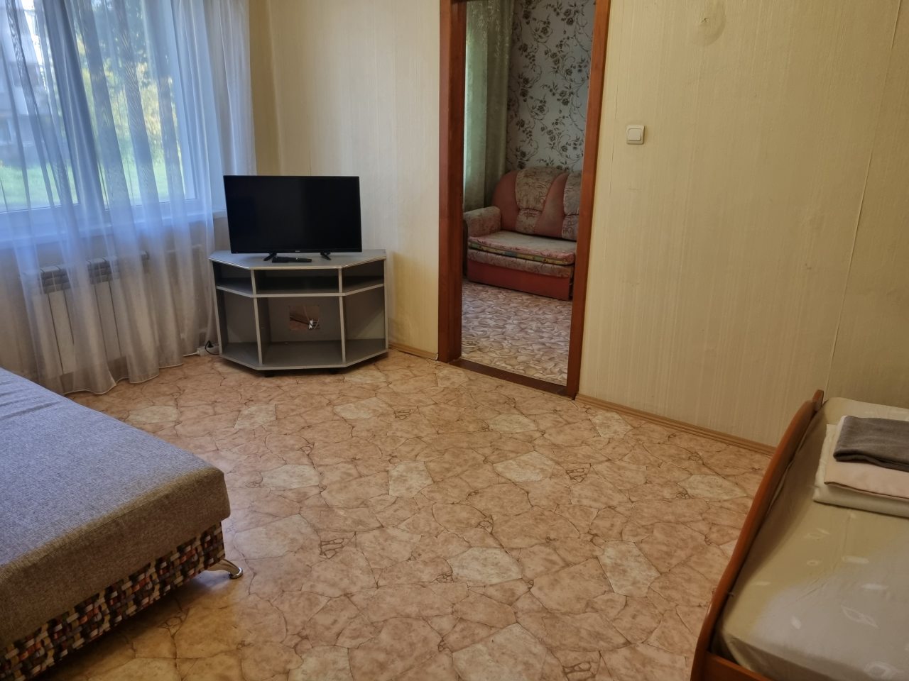 Квартира скромная, хрущевка. Комнаты две совмещены. При этом мебели немного, но достаточно для командировочных. Я была с коллегой, нам как раз удобно было две разные комнаты. Заселилась вовремя. Здесь постельное, посуда, вода горячая, в общем, как в любой квартире. Стоимость – лучшее, что было.