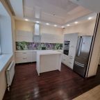 Кухонная зона оснащена большим холодильником, свч-печью, духовым шкафом, варочной панелью и вытяжкой.