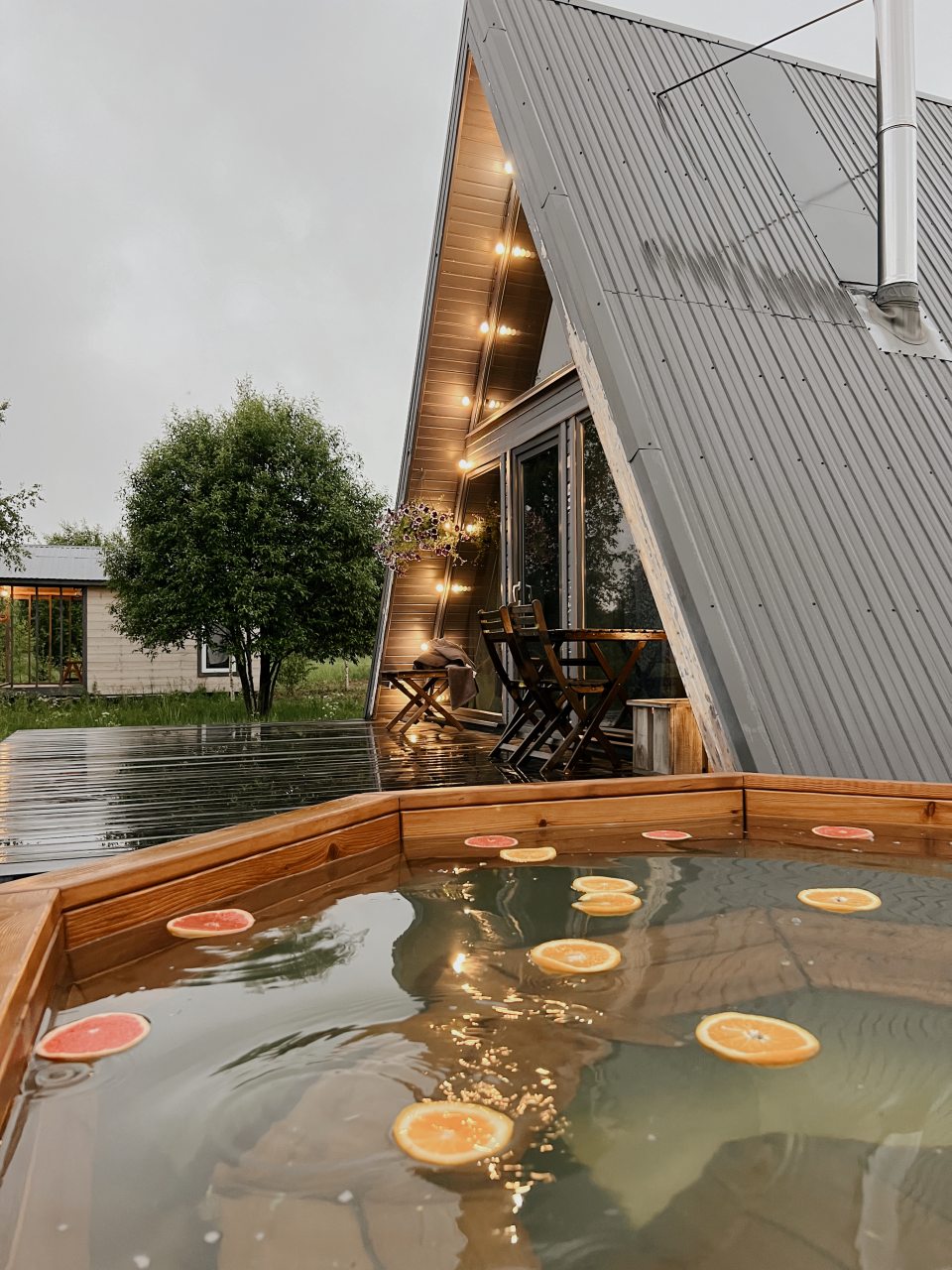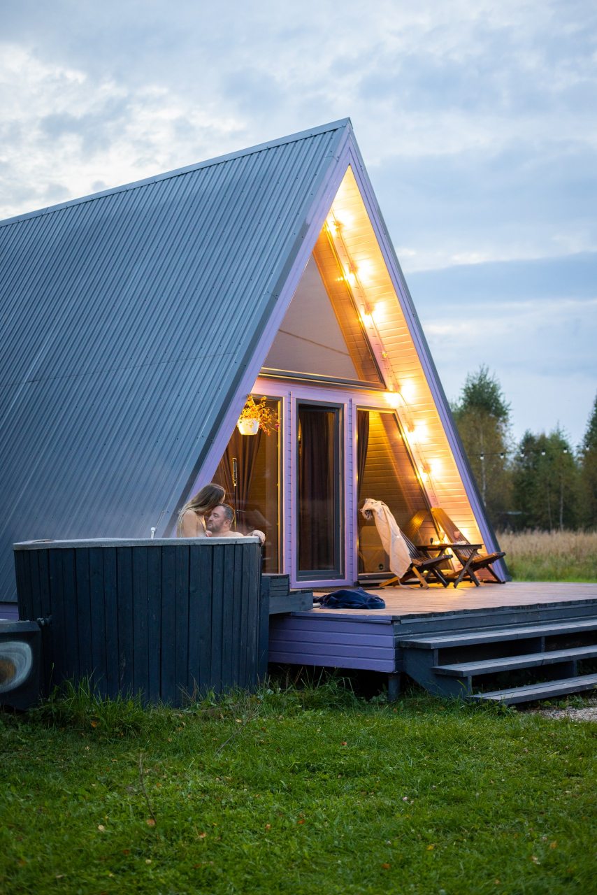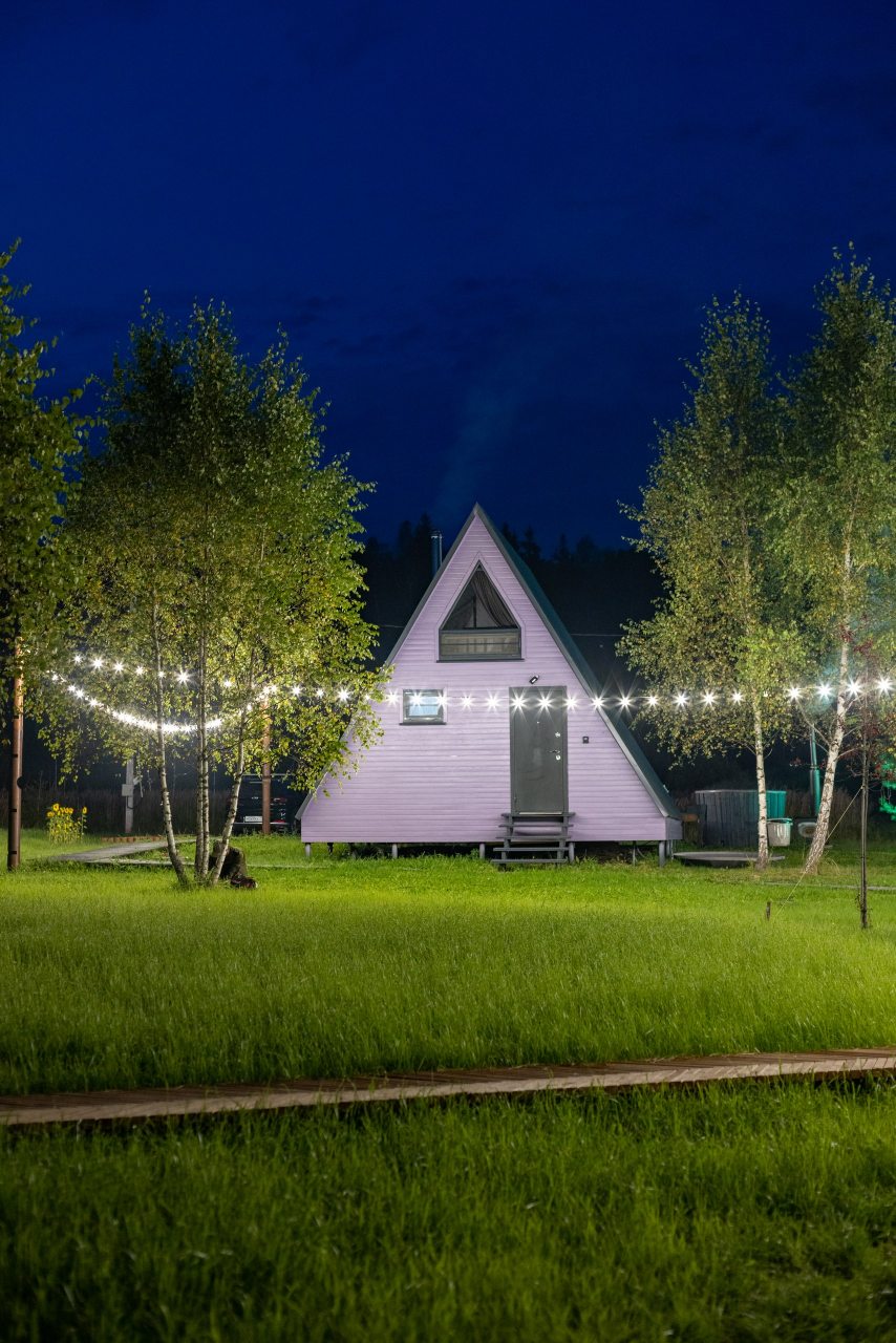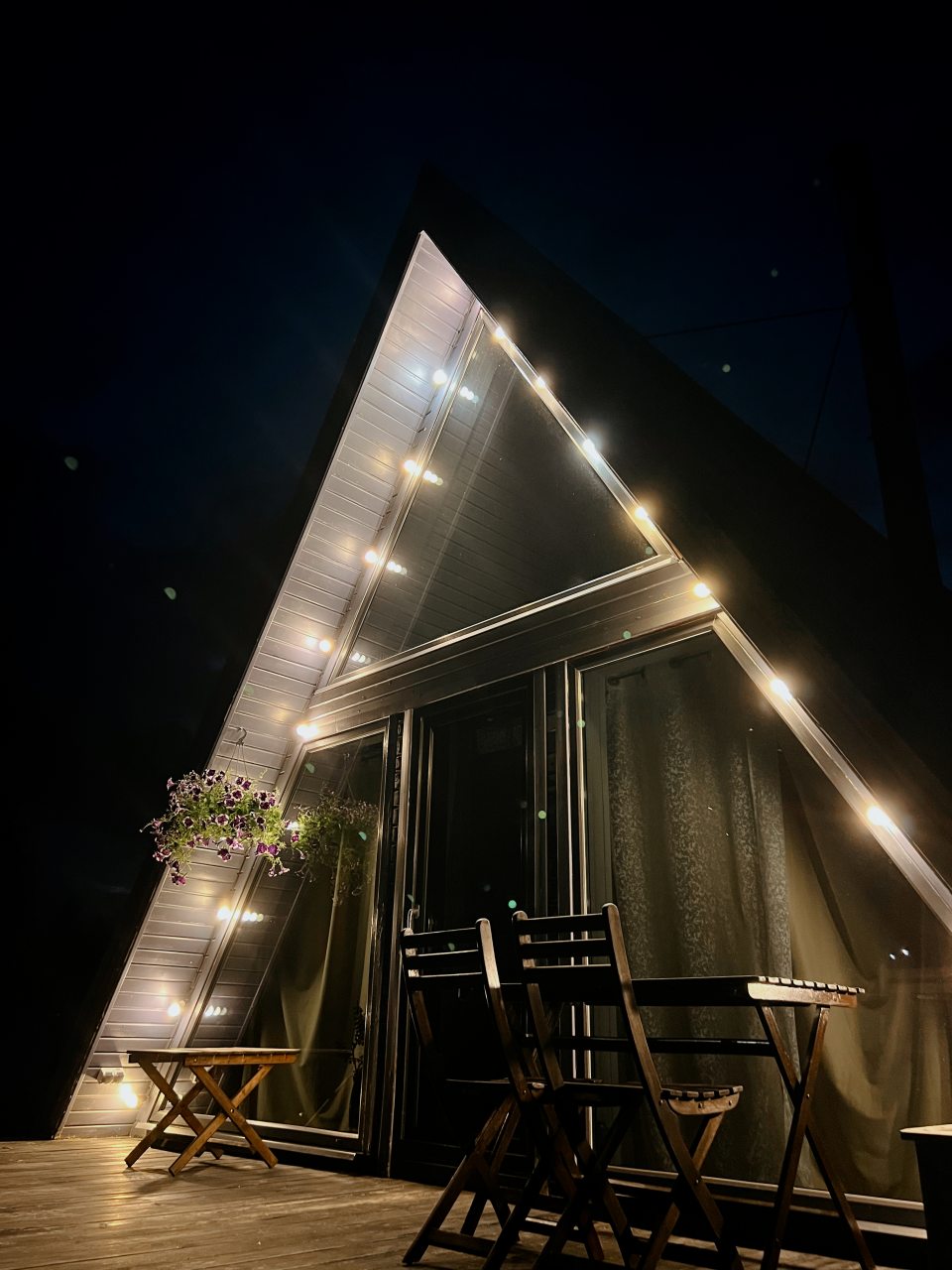 Гости могут расположиться в уютных а-фрейм домиках, в которых есть все современные удобства для лучшего отдыха: 2 спальных места на 4 гостей, ванная комната с гигиеническими средствами, телевизор, Wi-Fi, кондиционер, теплый пол и камин, кухонная зона. В каждом варианте размещения есть собственная терраса с уличной мебелью и банным чаном.