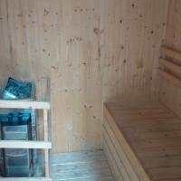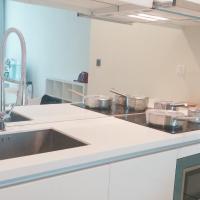 It includes a streaming flat-screen TV, a living room and a well-equipped kitchen.