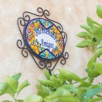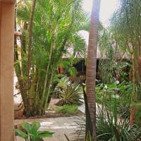 The hotel features a large tropical garden and warm, adobe-style decor.