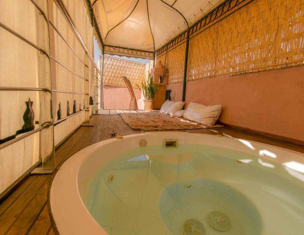 Гости могут отдохнуть на террасе с гидромассажной ванной и видом на мечеть Кутубия.
