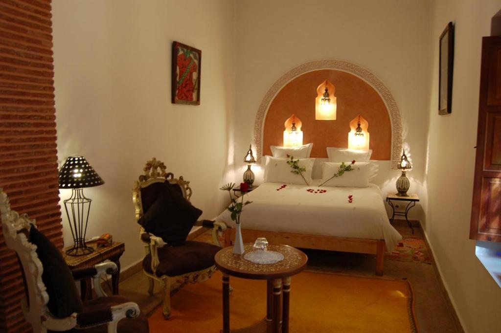 Номера риада Les Trois Palmiers с видом на патио оформлены в уникальном стиле и оснащены кондиционером.
