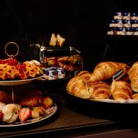 В отеле гостям предлагается разнообразный завтрак, включая хлеб, нарезку для бутербродов, соки и свежие фрукты.