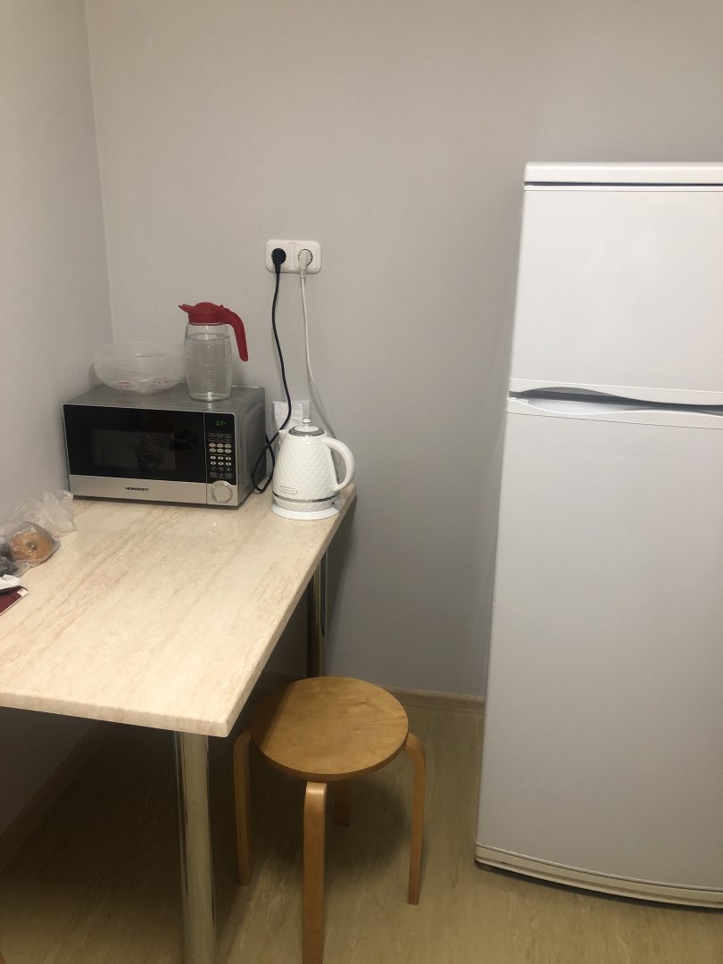 Удобный номер, хоть и небольшая, но отдельная кухня. Большой холодильник, плита, микроволновка, чайник, посуда. Всё что нужно.