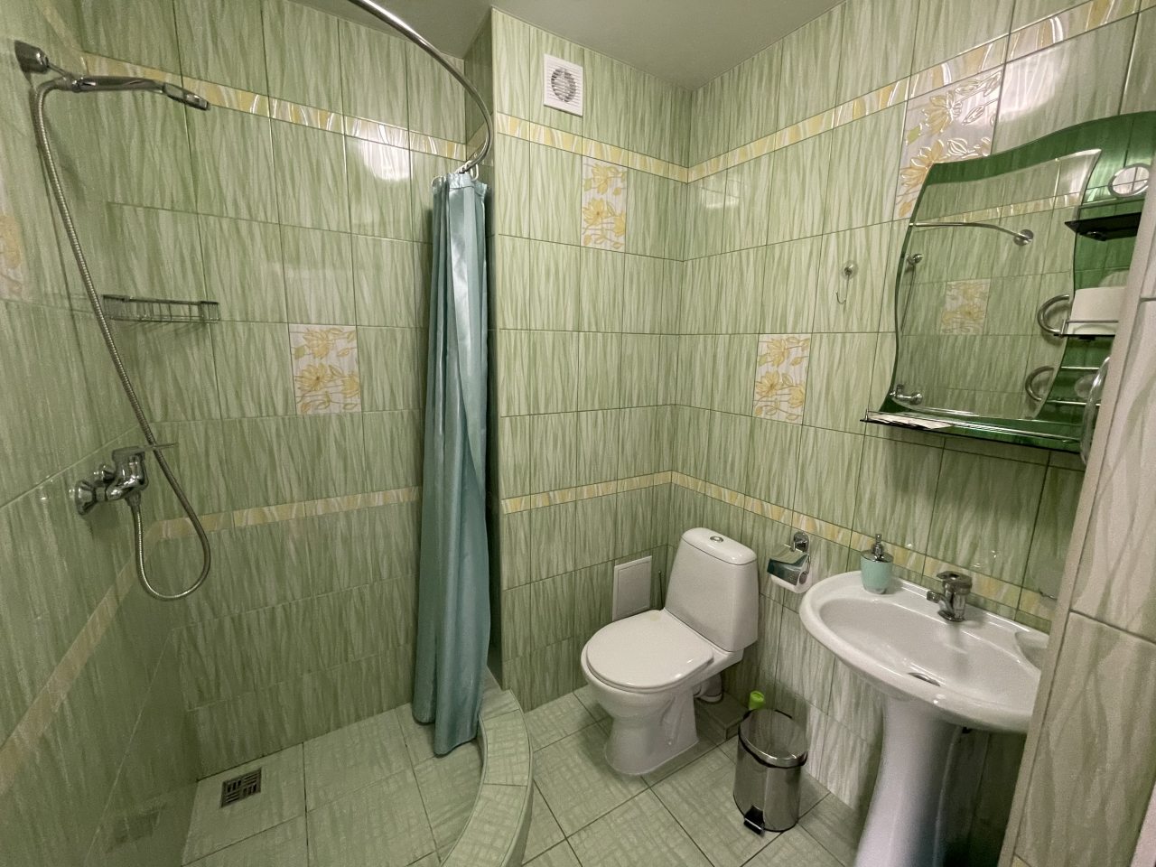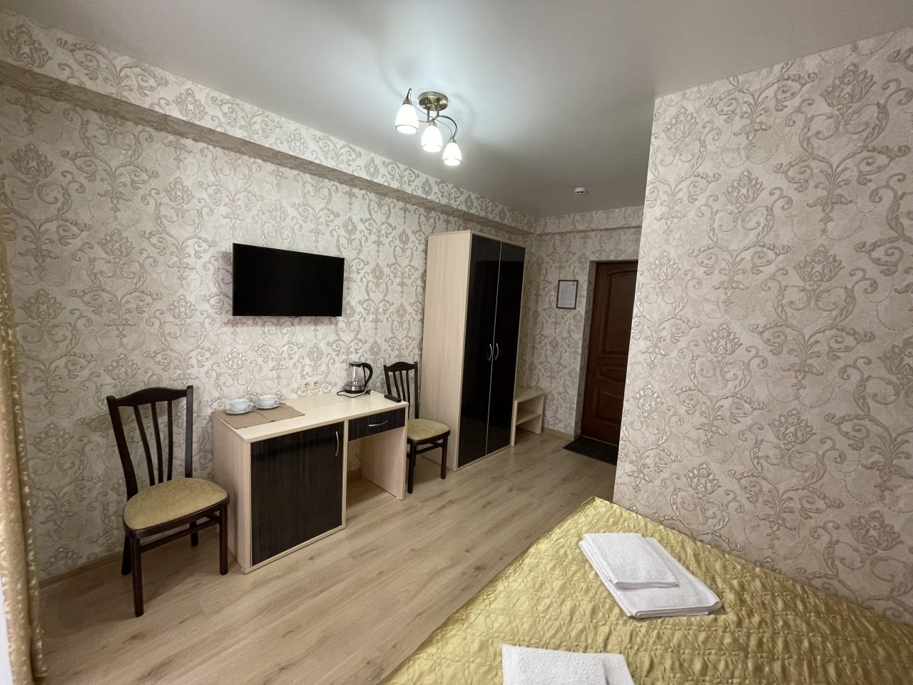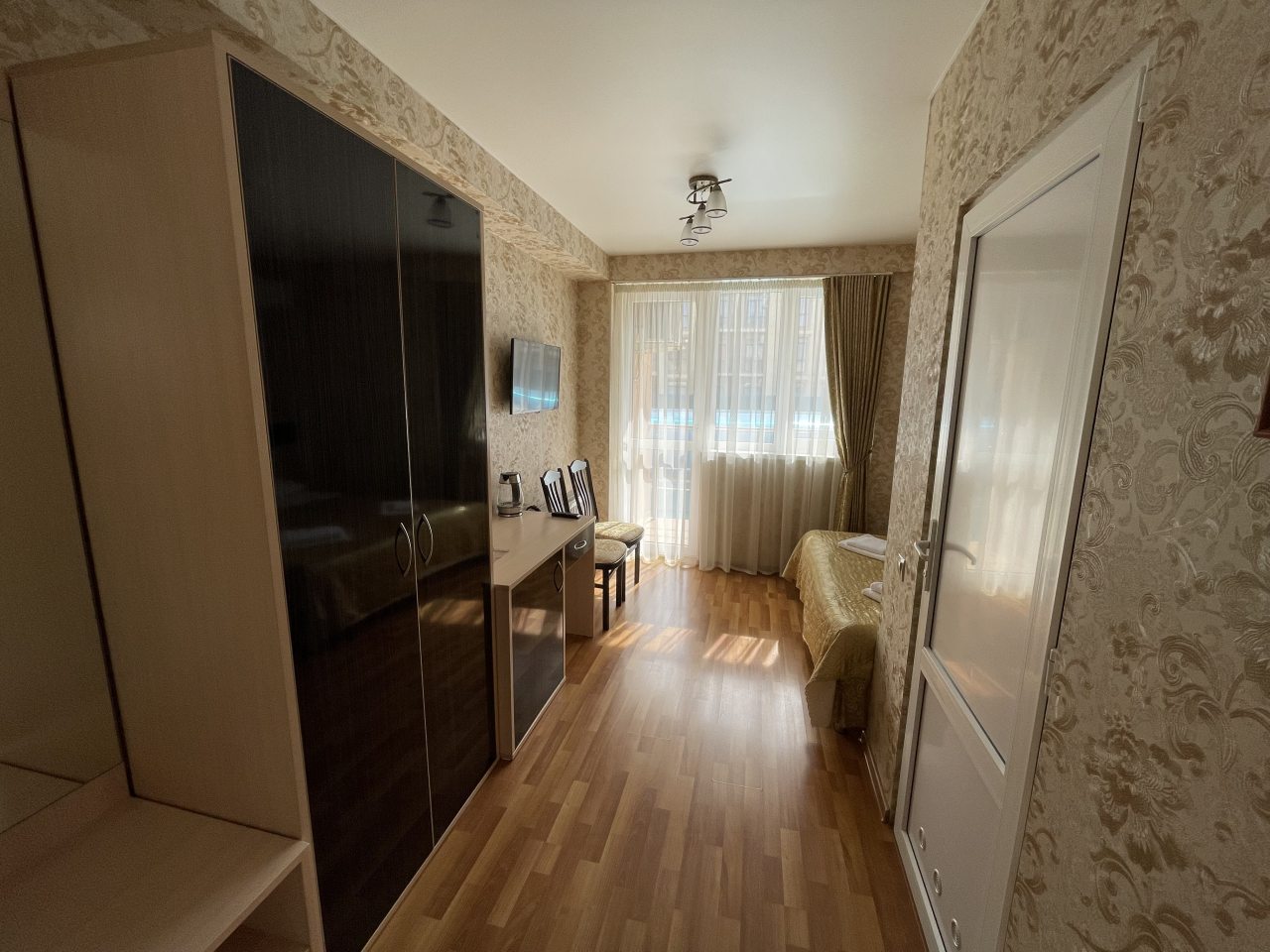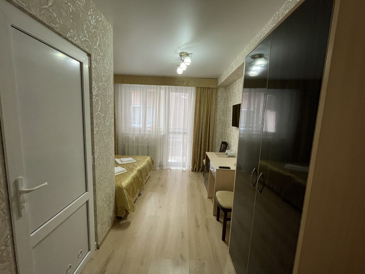Номер представляет собой просторную комнату с некоторой техникой. Места много, вид из окон приятный. Есть кровать двуспальная и еще диван, который раскладывается. Мы были тут вдвоем с мужем, так что диван не раскладывался. Есть постель приличного качества и полотенца, в ванной гигиена.