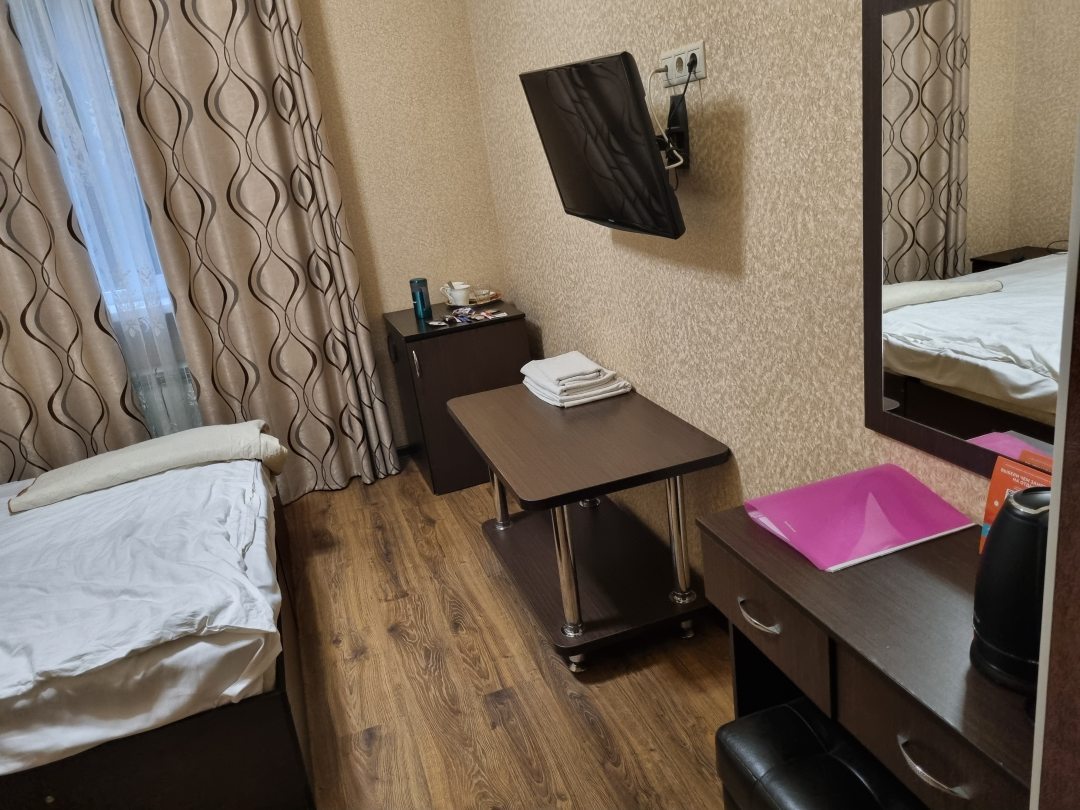Номер удобный. Всё есть и работает: телевизор, чайник, холодильник, полотенца, фен, шампунь, гель, посуда. В коридоре на этаже микроволновка и утюг.