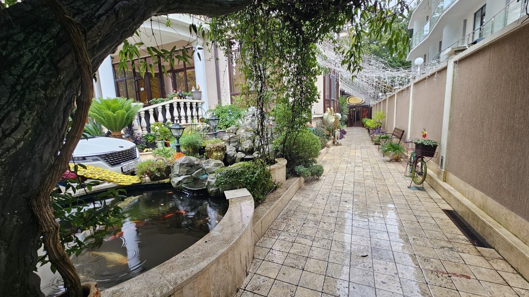 Небольшой отельчик с теплым бассейном, есть небольшой внутренний двор, бар. Очень милая администратор и в целом персонал приятный. Находится на основной курортной улице, где стоят небольшие недорогие отели, граничит через реку с жилым районом. Недалеко есть столовая и пятёрочка, ближайший пляж в минутах 7 ходьбы.