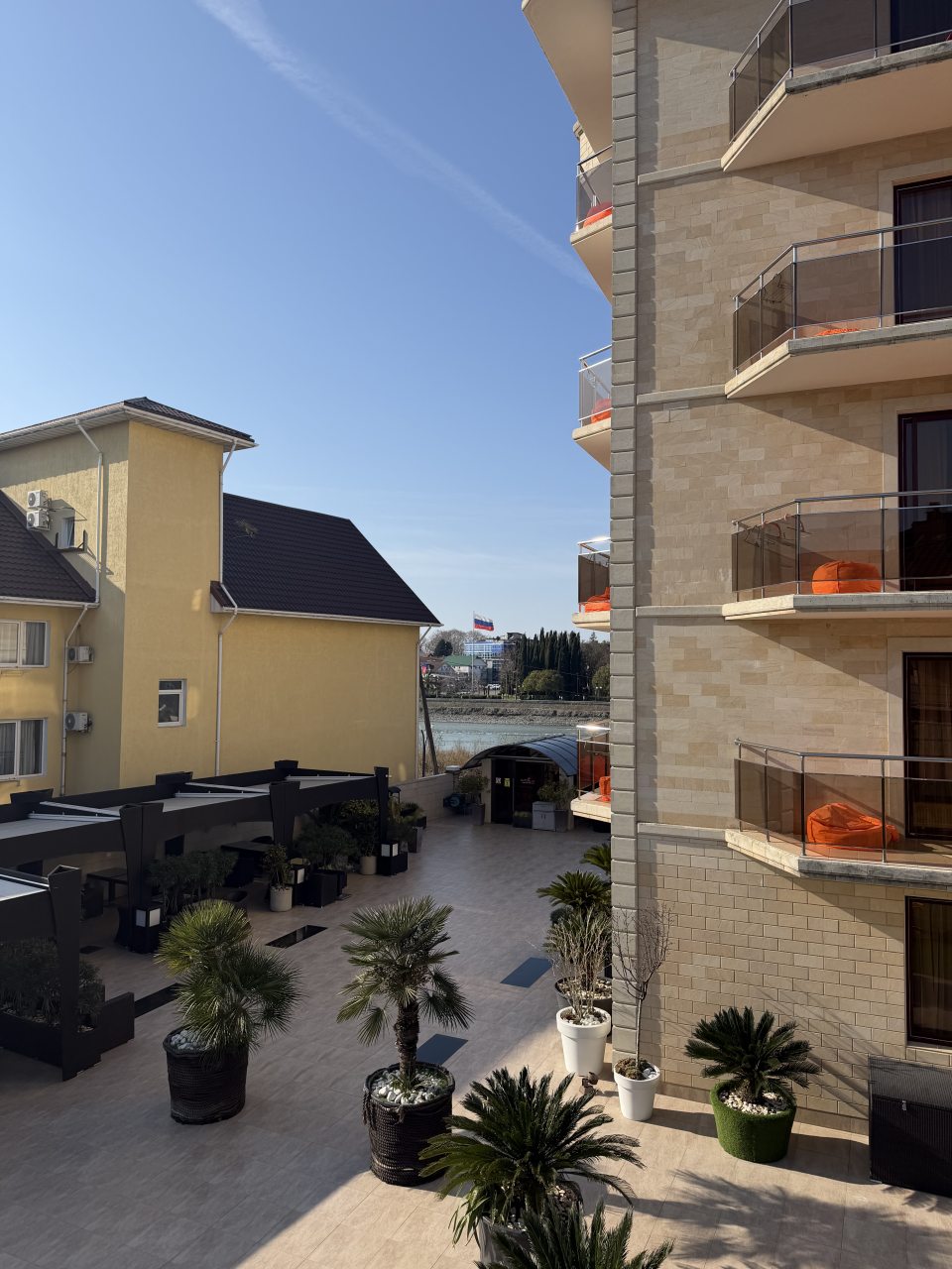 Расположение, рядом, в пешей доступностився требуемая инфрастуктура, столовые, море, магазин качественного вина и пива, набережная реки Мзымта, с которой открывается потрясающая панорама на горы