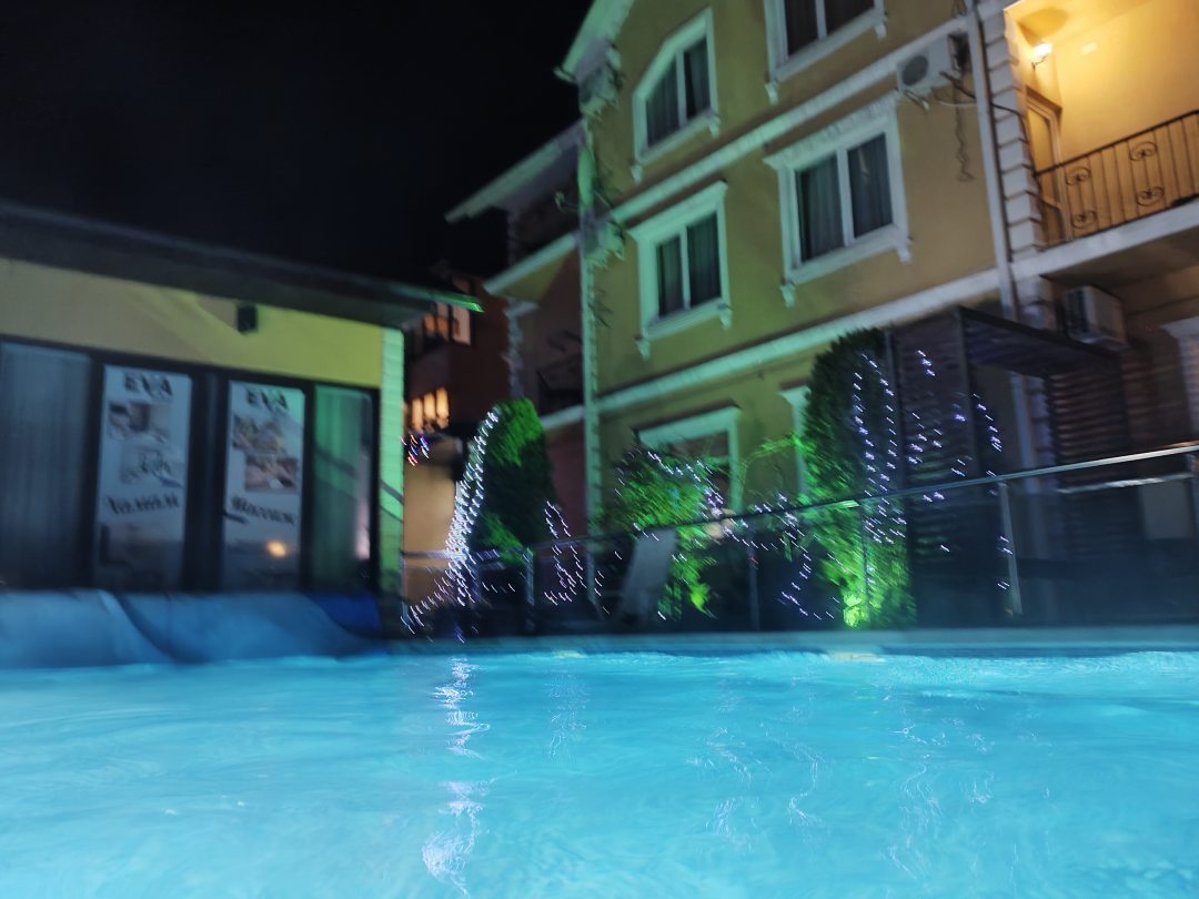 Рядом с морем. Кормят отлично. Каши, сырники, блинчики, овощи на завтрак. Все удобства в номере. Отличная кровать, матрас, подушки, что очень важно. Есть в номере, плита, микроволновая печь. Окна в пол. Бассейн с подогревом. Отдельное спасибо за чистоту. И в номере и во дворе. Чудесный двор с деревьями, кустарники, цветами.
