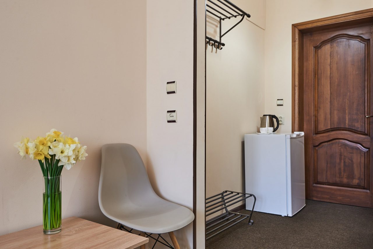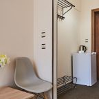 Номер хороший, большой, есть все необходимое. В номере холодильник, чайник, столовые приборы, фен, на этаже кулер, микроволновка, гладильная доска с утюгом. Все понравилось! Месторасположение вообще отличное! Рядом красивый храм, до набережной близко, летом вощможно будет шумно, так как оживленное место. Брали без питания, поэтому ничего не могу сказать.