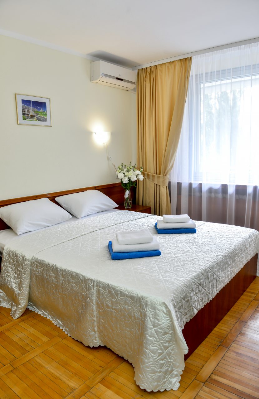 Около ста тридцати номеров с балконами и кондиционерами. Примерно половина километра до центра Алушты. Несколько сотен метров до пляжа. Чистая, хорошо озеленённая территория. Большое количество цветочных насаждений. Настольный теннис.