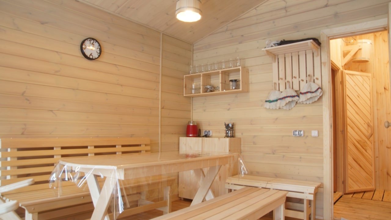 Просторная и благоустроенная территория радует глаз чистотой и ухоженностью. Для любителей шашлыка предусмотрена отдельная мангальная площадка с раковиной, а также две крытые беседки. Домики содержатся в идеальном порядке, кровати комфортные, и пространства вполне достаточно для размещения шести взрослых. Отдельно стоит отметить отличную баню, которую мы арендовали на два часа. Там было безупречно чисто, есть джакузи с теплой водой и прохладная купель.