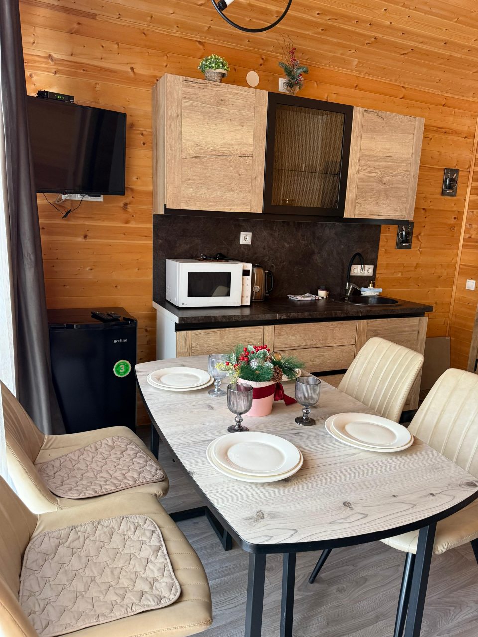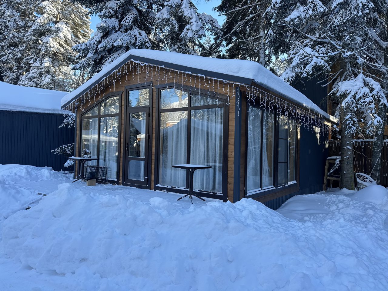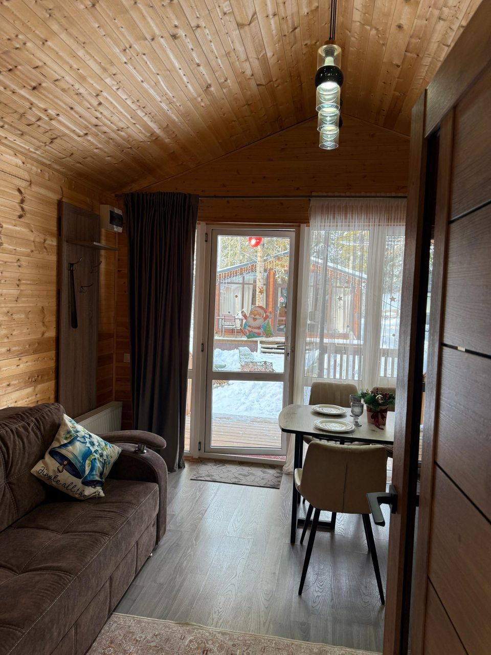 Территория ухожена, при этом сохранилась дикая прелесть — не бетон и плитка, а тропинки и мох. В домиках тепло, уютно, а особенно порадовали панорамные окна на лес. Отдыхали вдвоём, и чувствовали себя так, будто мы единственные на всей базе. Понравилось, что разрешают приезжать с питомцами — наш пёс был в восторге от прогулок. Можно арендовать велосипеды, что мы и сделали. Атмосфера располагает к неспешности и тишине.
