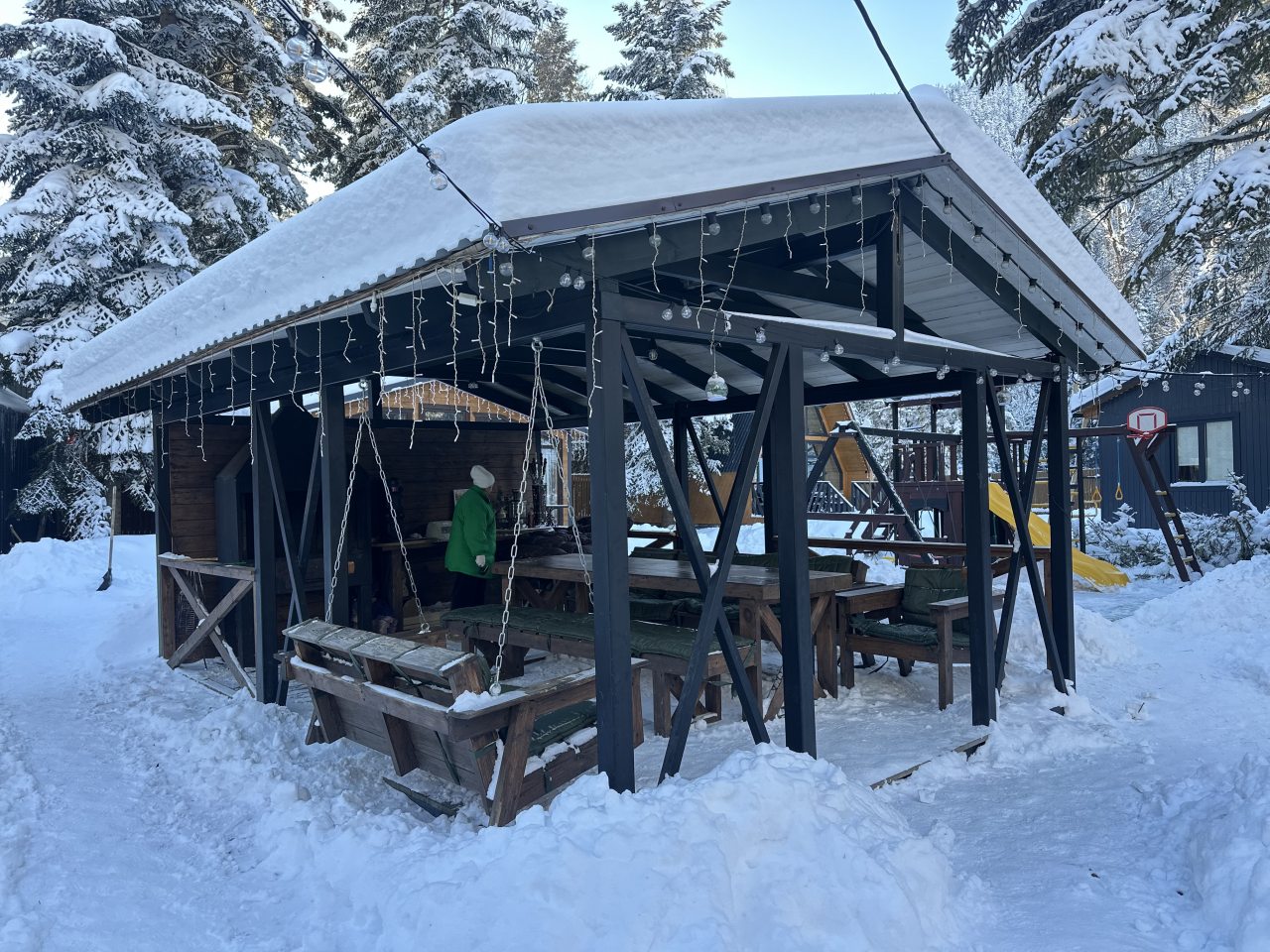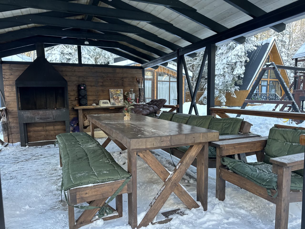 Понравилась мангальная зона. В беседке есть все что пожелаете, шампура, сетка для жарки, огромный стол и качеля. Еще понравилось,что стояла колонка музыкальная(переживали что свою оставили).