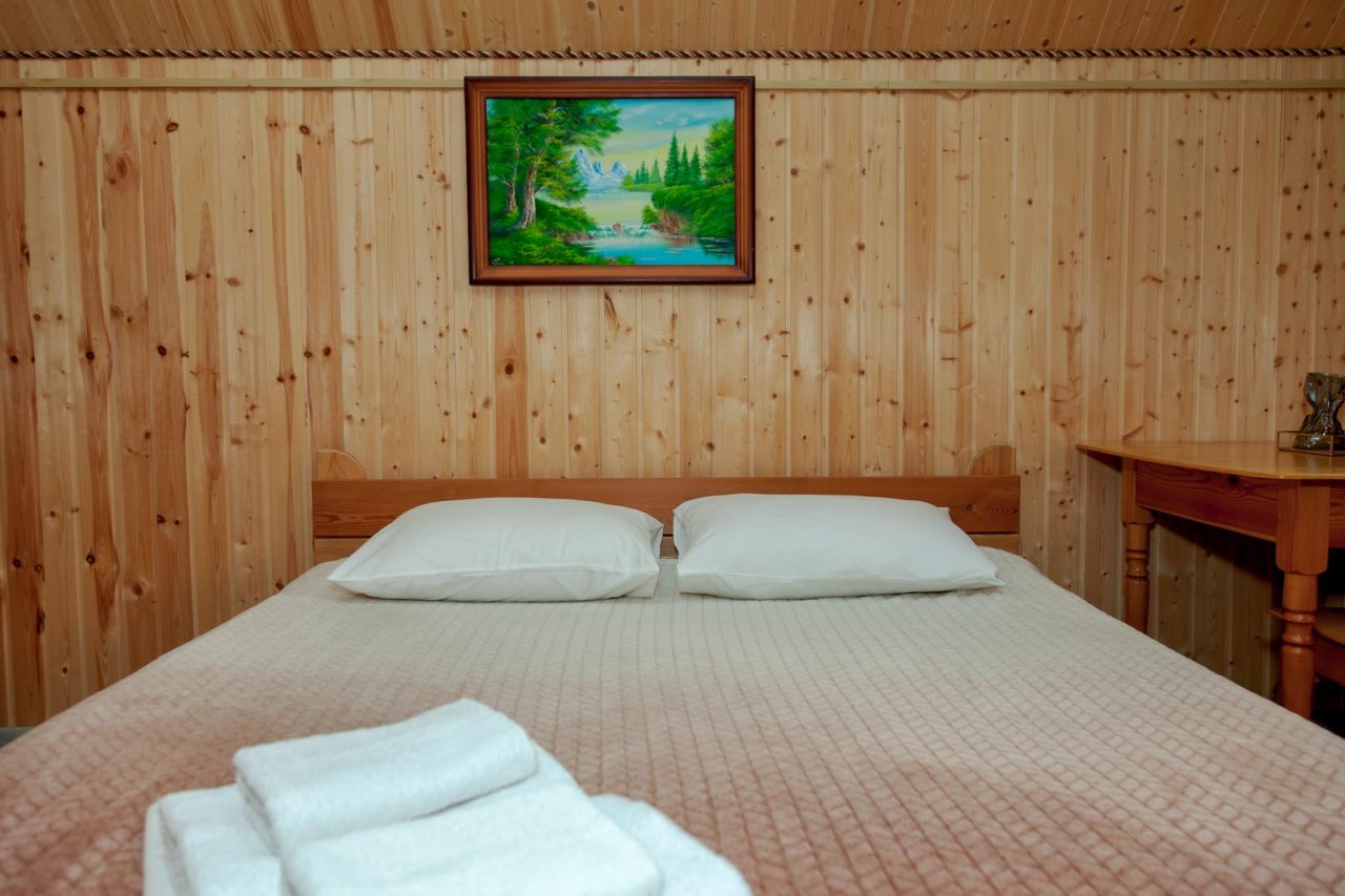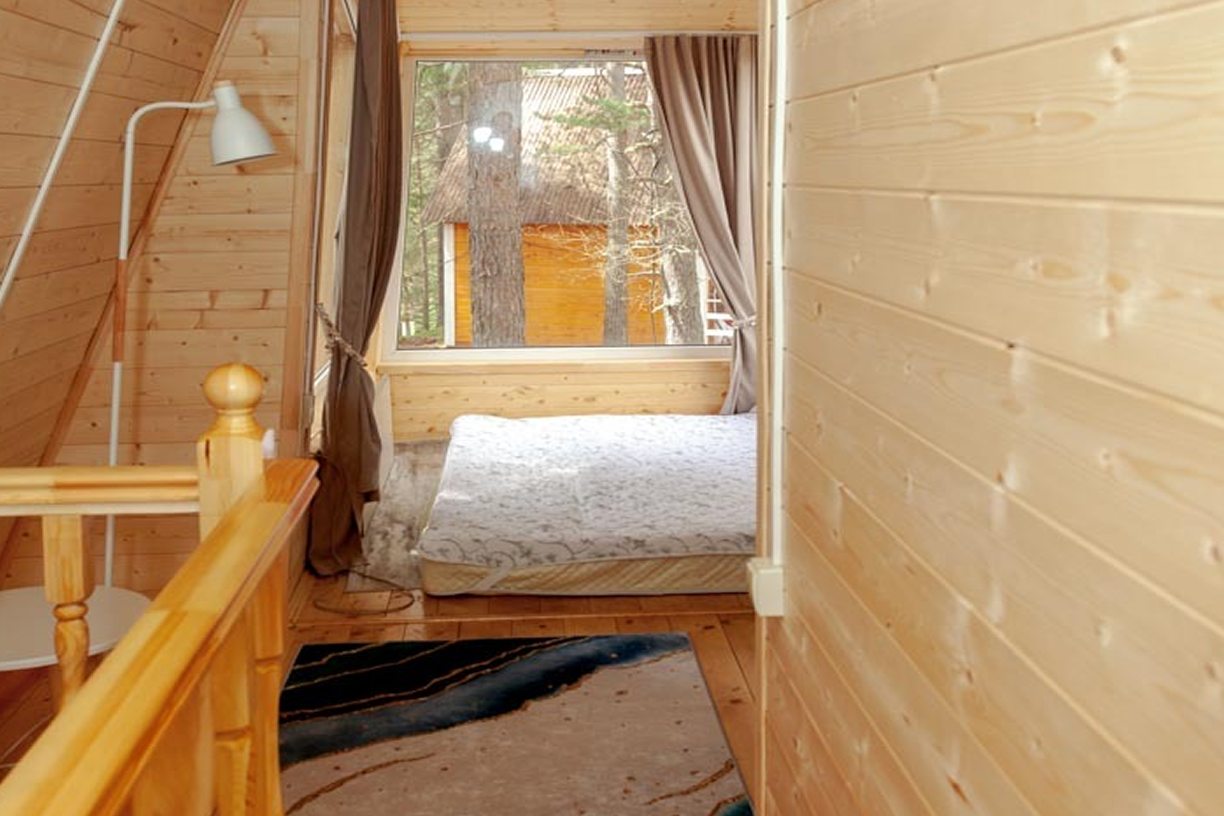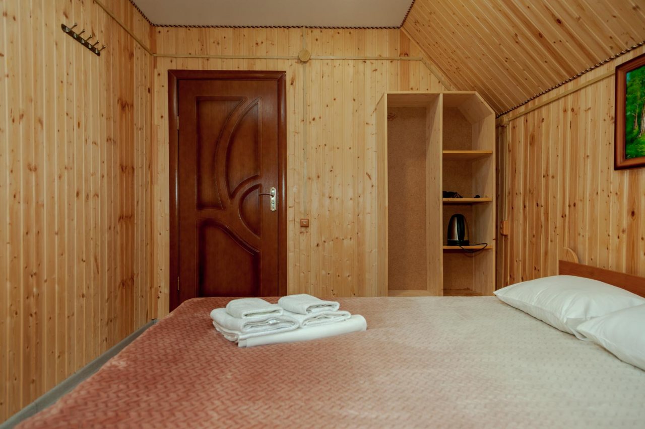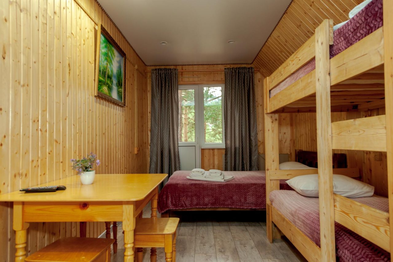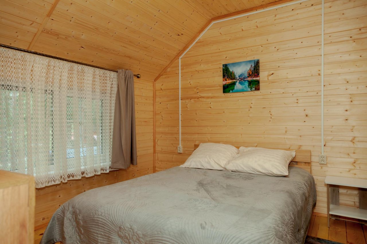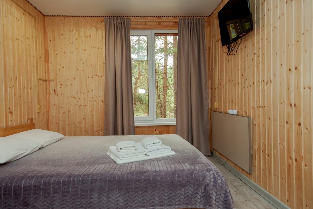Неплохая база отдыха, новая, все с нуля, похоже. Благодаря этому постельное, полотенца все свежее, не застиранное. Обстановка в домике простая, ничего лишнего, есть кровати деревянные, стол с лавками, мебель, ванная. Готовить еду можно на открытом огне, на мангале. Кушать лучше на улице с видом на лес.