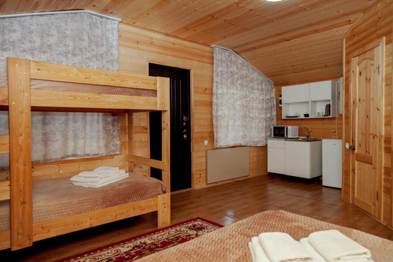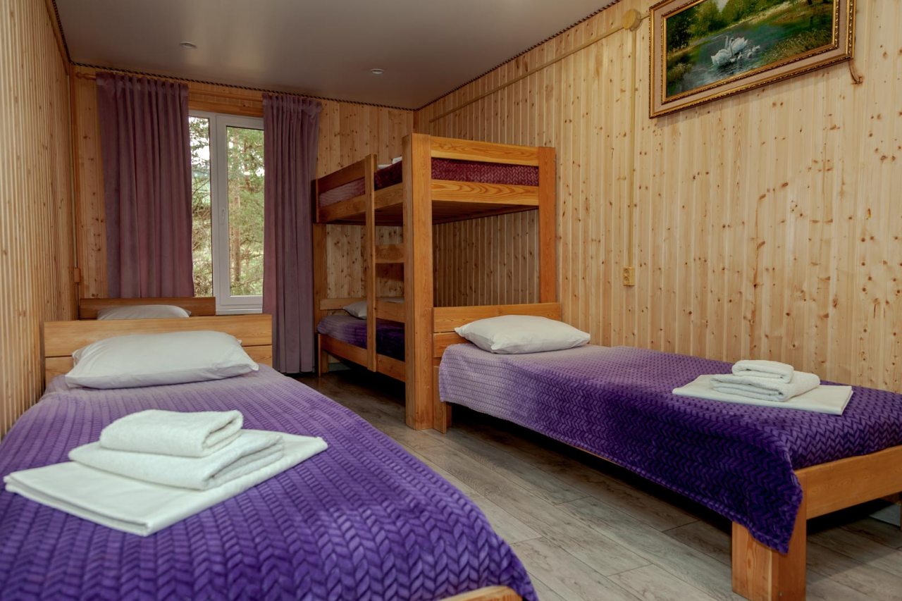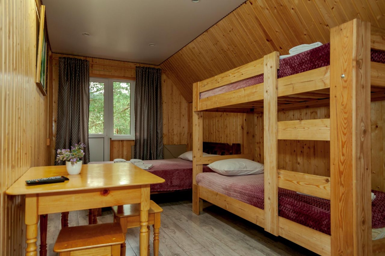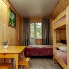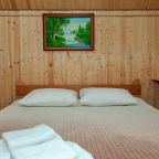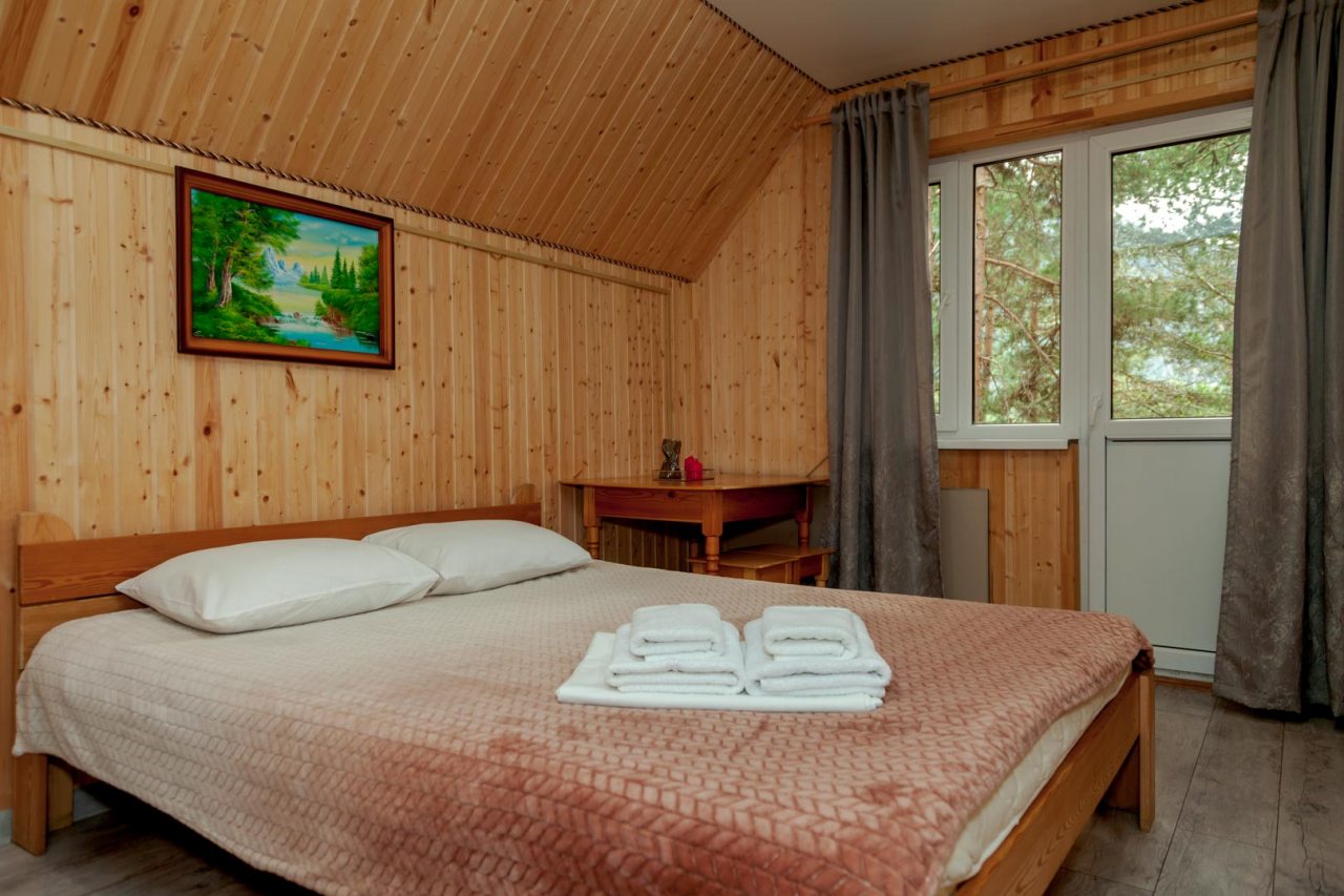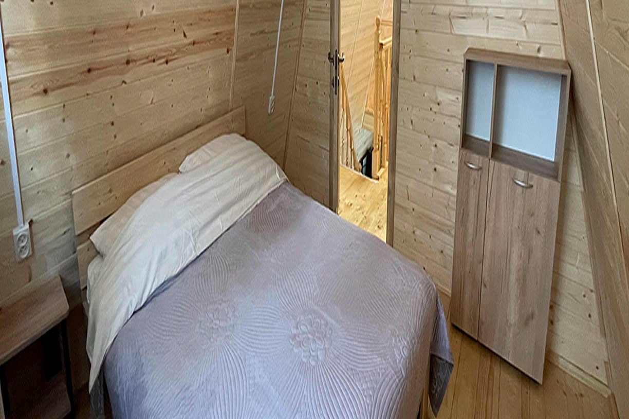 Неплохая база отдыха, новая, все с нуля, похоже. Благодаря этому постельное, полотенца все свежее, не застиранное. Обстановка в домике простая, ничего лишнего, есть кровати деревянные, стол с лавками, мебель, ванная. Готовить еду можно на открытом огне, на мангале. Кушать лучше на улице с видом на лес.