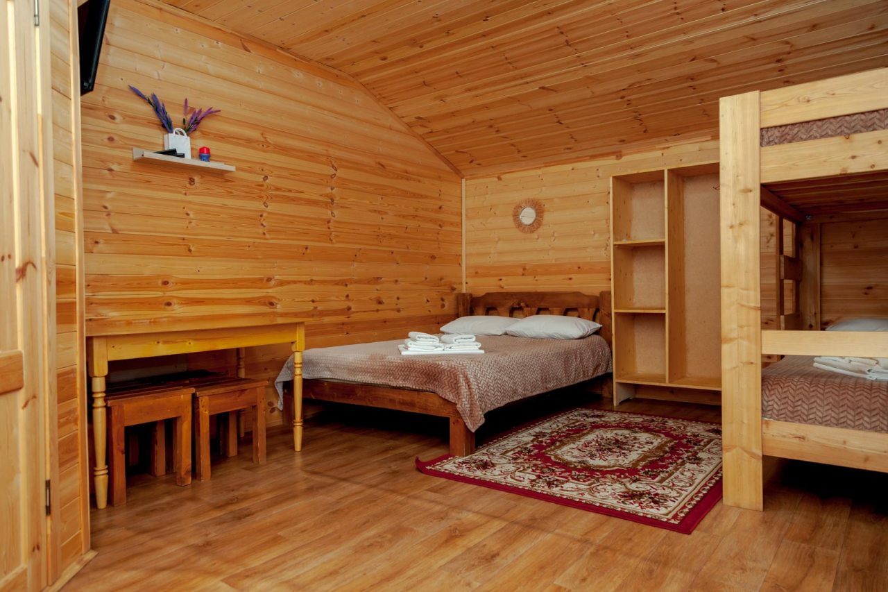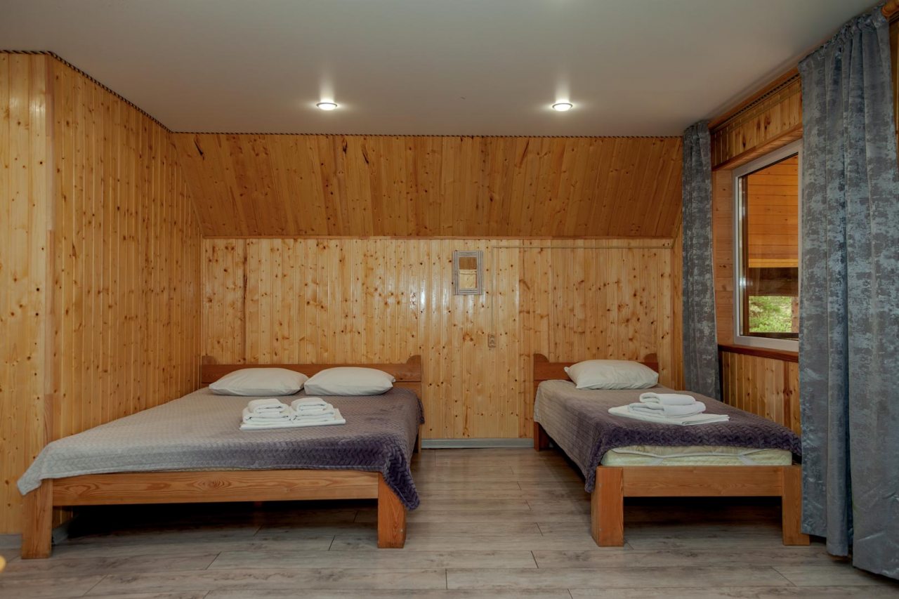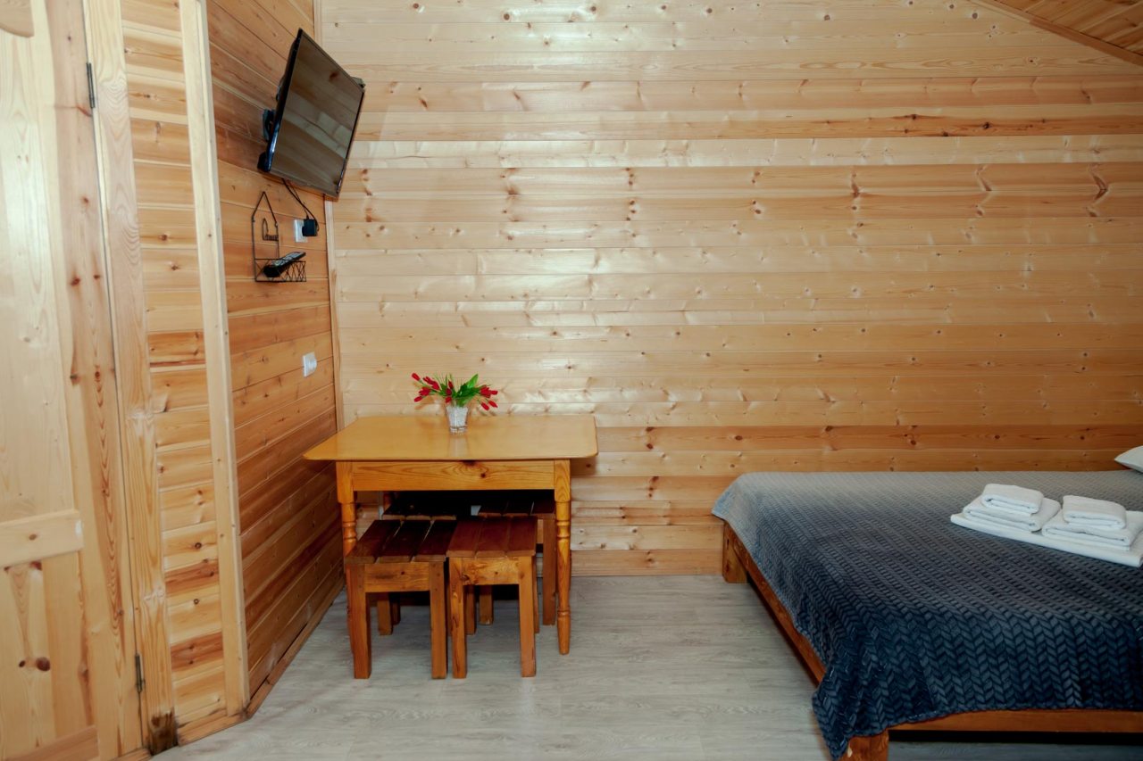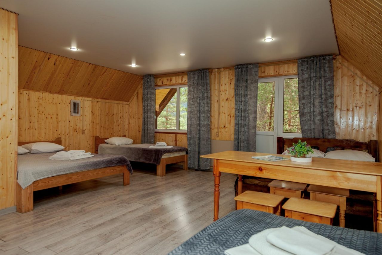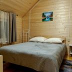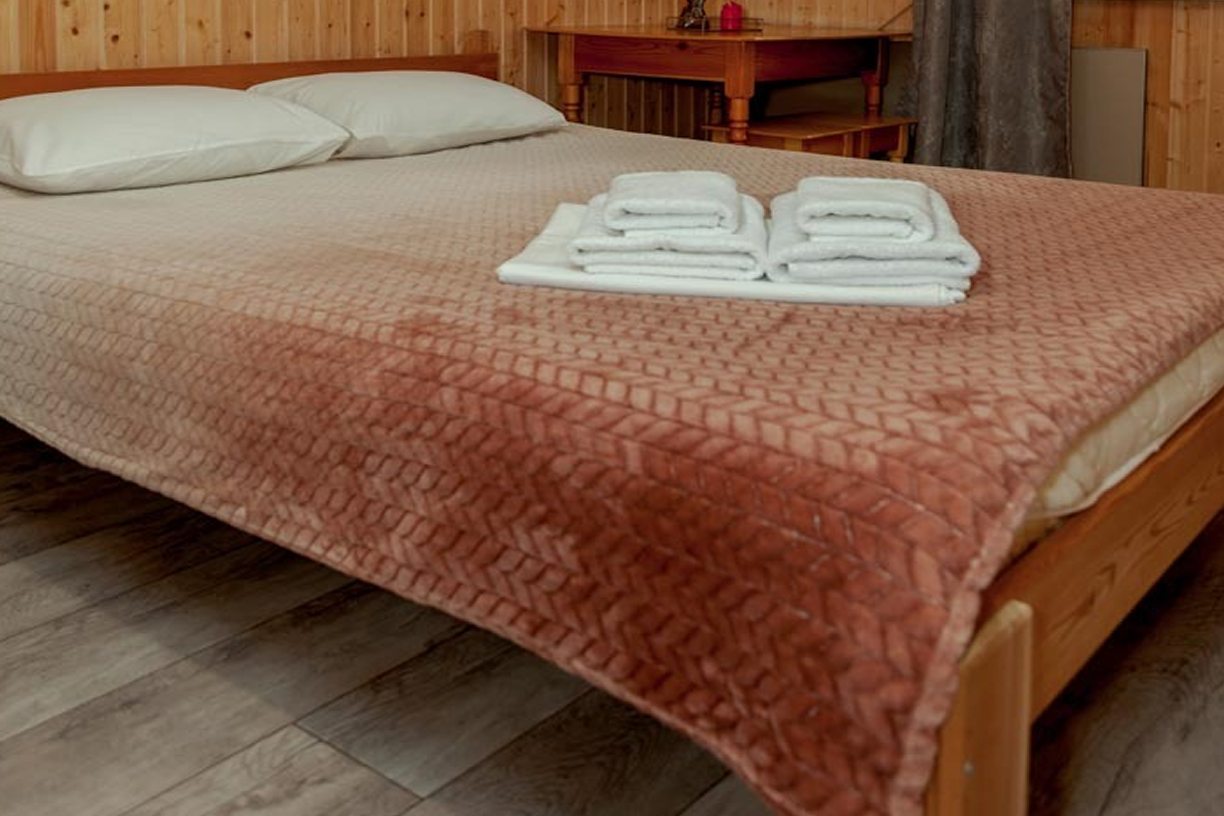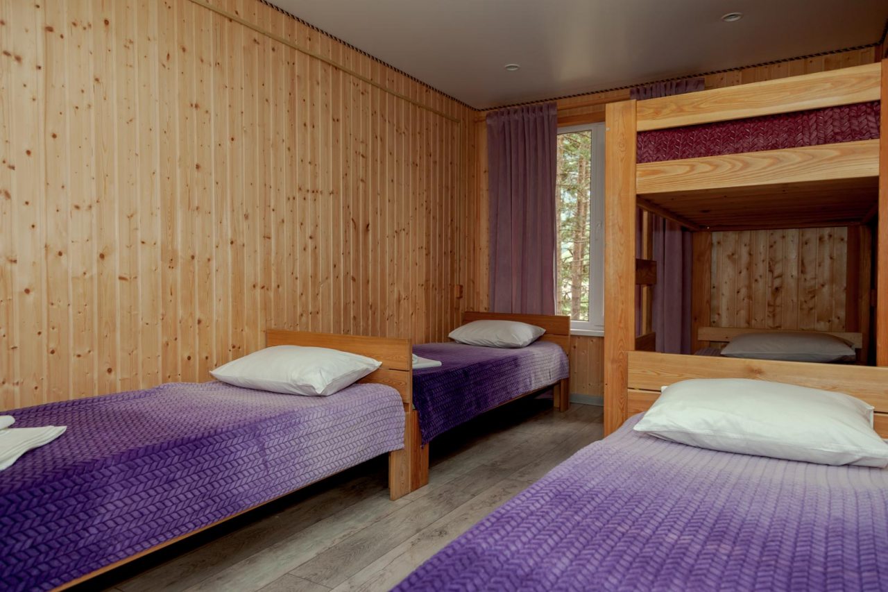 Неплохая база отдыха, новая, все с нуля, похоже. Благодаря этому постельное, полотенца все свежее, не застиранное. Обстановка в домике простая, ничего лишнего, есть кровати деревянные, стол с лавками, мебель, ванная. Готовить еду можно на открытом огне, на мангале. Кушать лучше на улице с видом на лес.