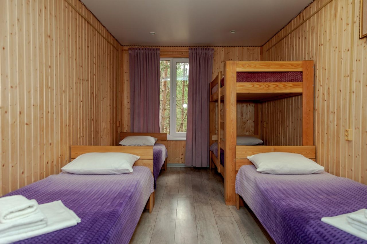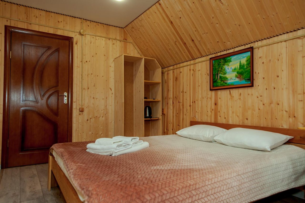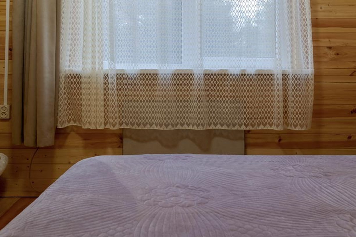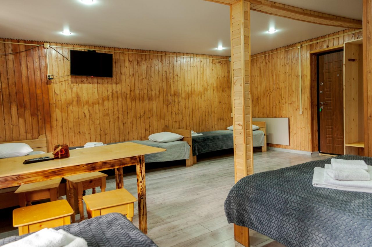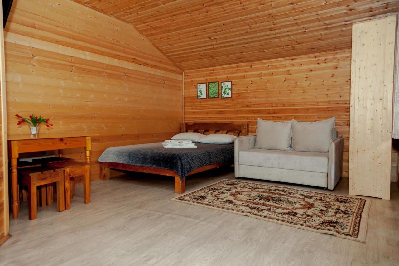 Неплохая база отдыха, новая, все с нуля, похоже. Благодаря этому постельное, полотенца все свежее, не застиранное. Обстановка в домике простая, ничего лишнего, есть кровати деревянные, стол с лавками, мебель, ванная. Готовить еду можно на открытом огне, на мангале. Кушать лучше на улице с видом на лес.