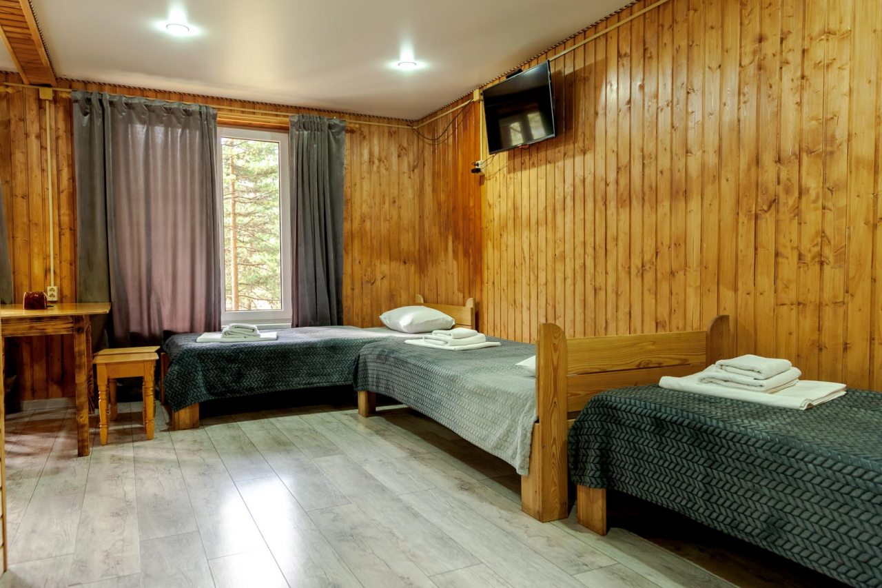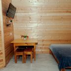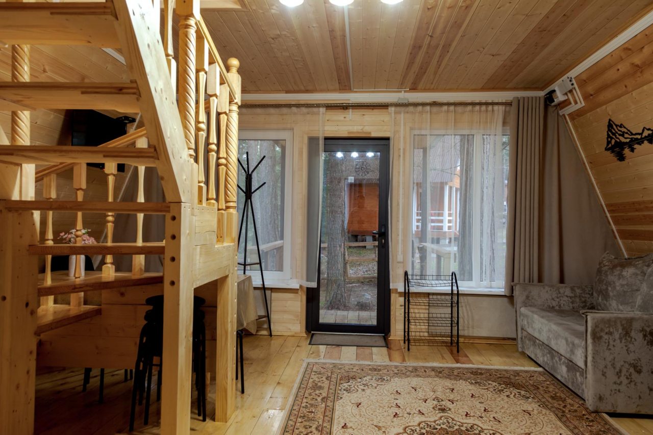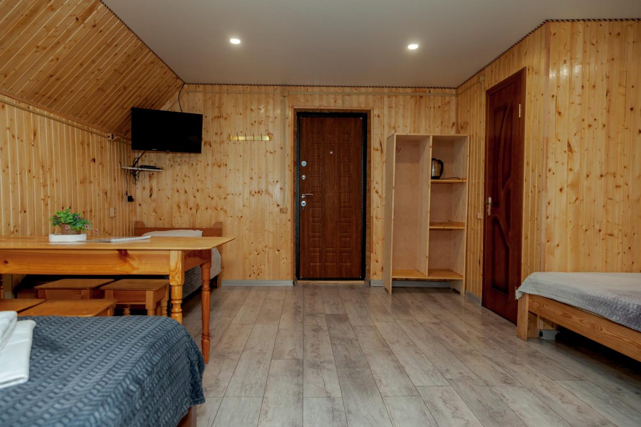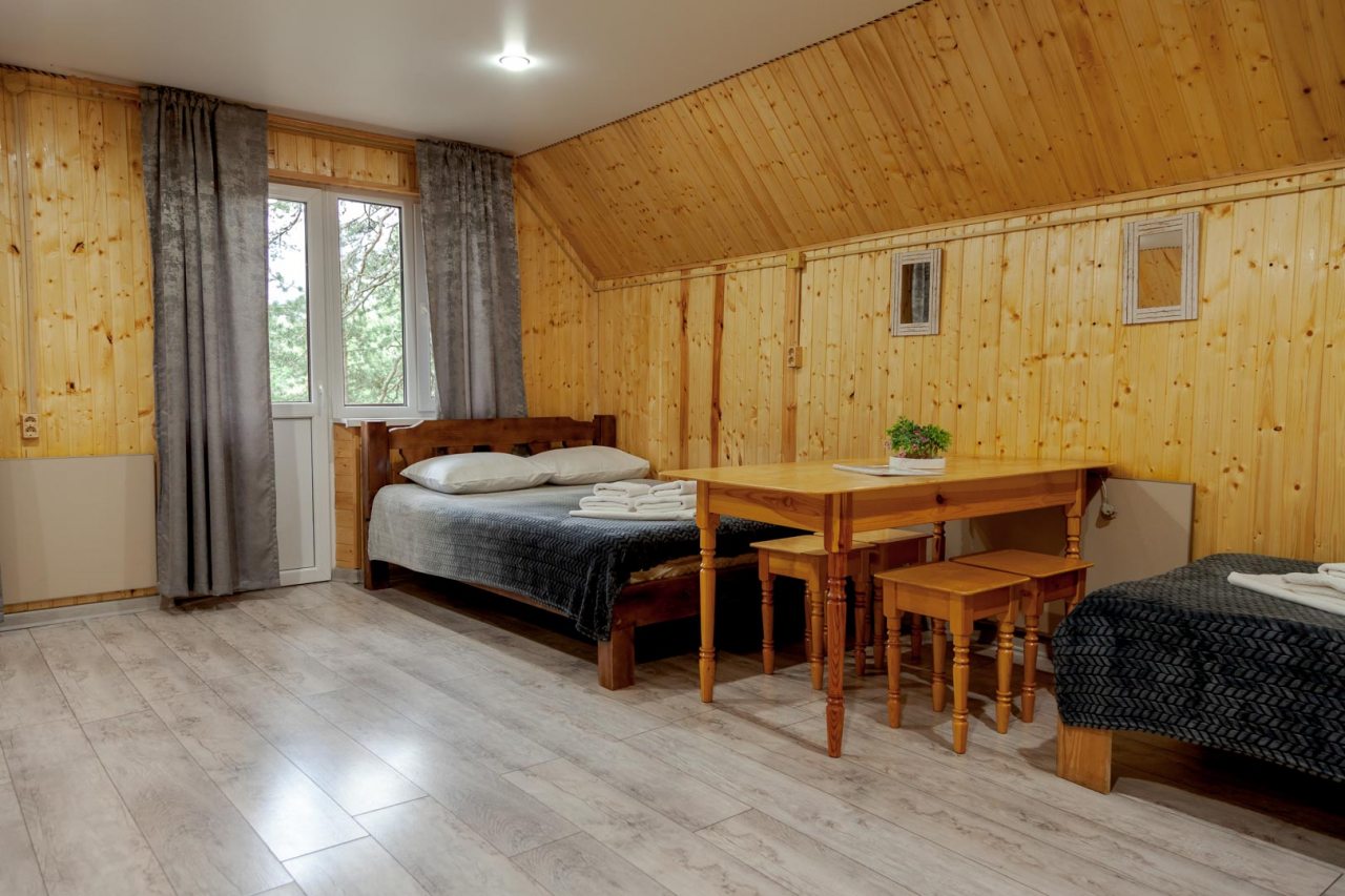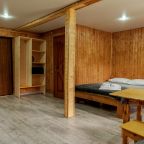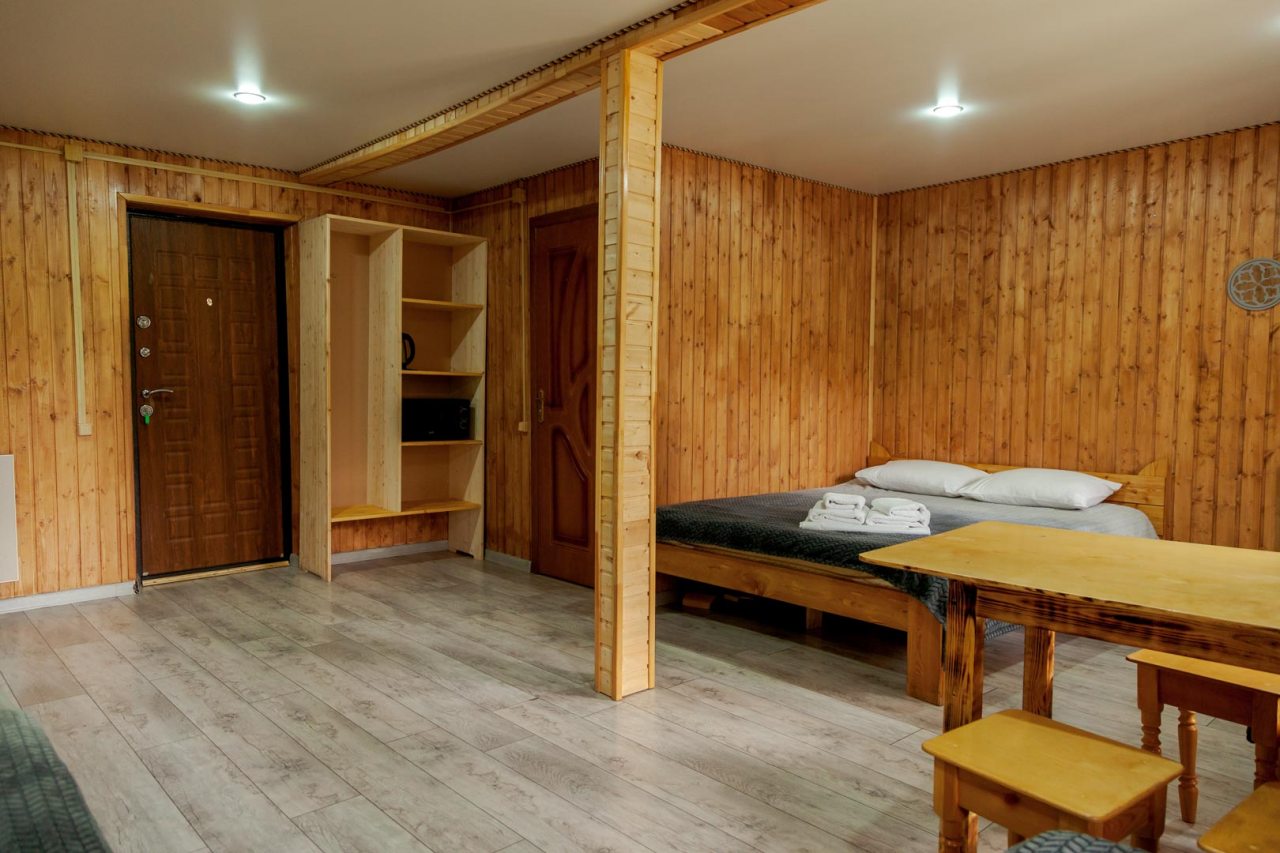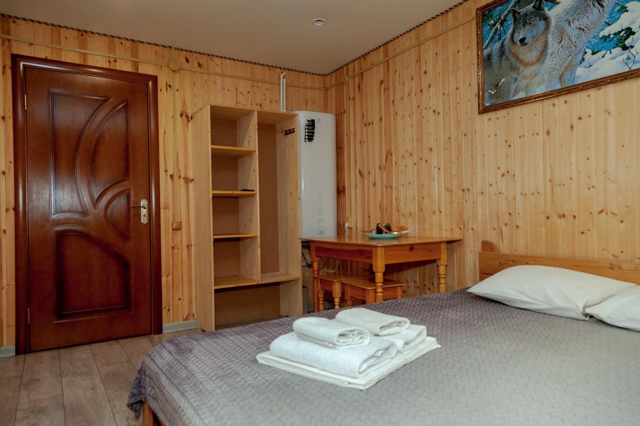 Неплохая база отдыха, новая, все с нуля, похоже. Благодаря этому постельное, полотенца все свежее, не застиранное. Обстановка в домике простая, ничего лишнего, есть кровати деревянные, стол с лавками, мебель, ванная. Готовить еду можно на открытом огне, на мангале. Кушать лучше на улице с видом на лес.