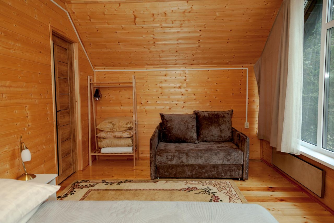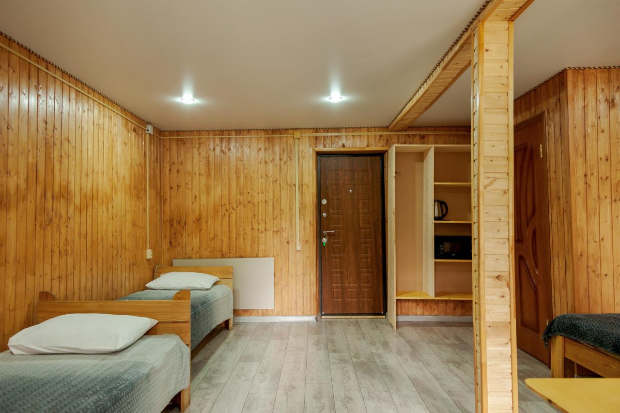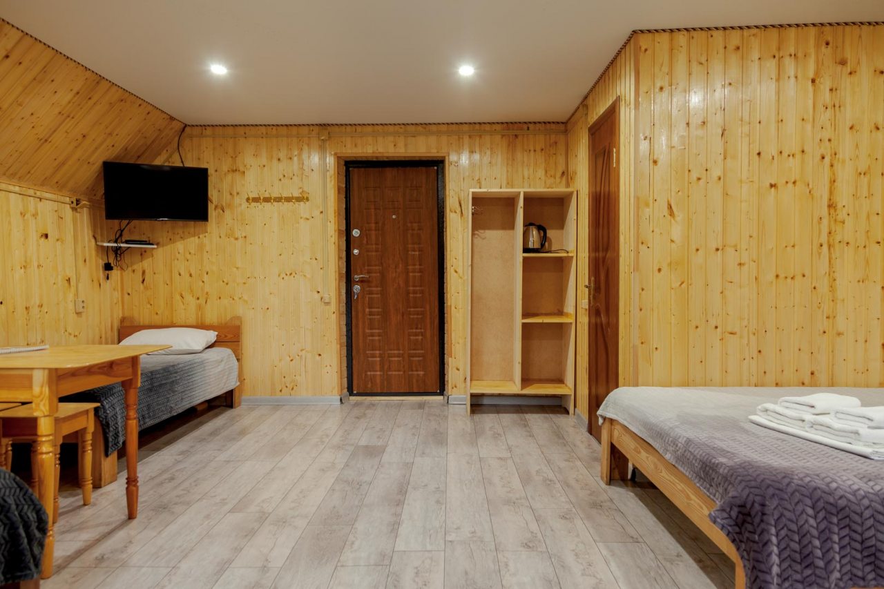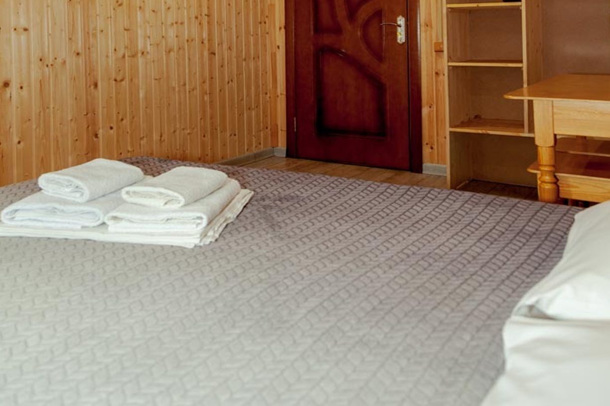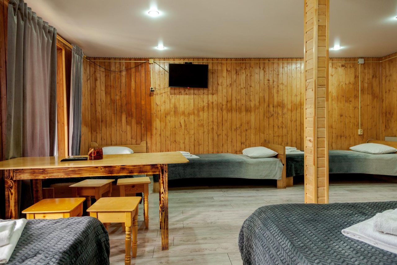 Неплохая база отдыха, новая, все с нуля, похоже. Благодаря этому постельное, полотенца все свежее, не застиранное. Обстановка в домике простая, ничего лишнего, есть кровати деревянные, стол с лавками, мебель, ванная. Готовить еду можно на открытом огне, на мангале. Кушать лучше на улице с видом на лес.