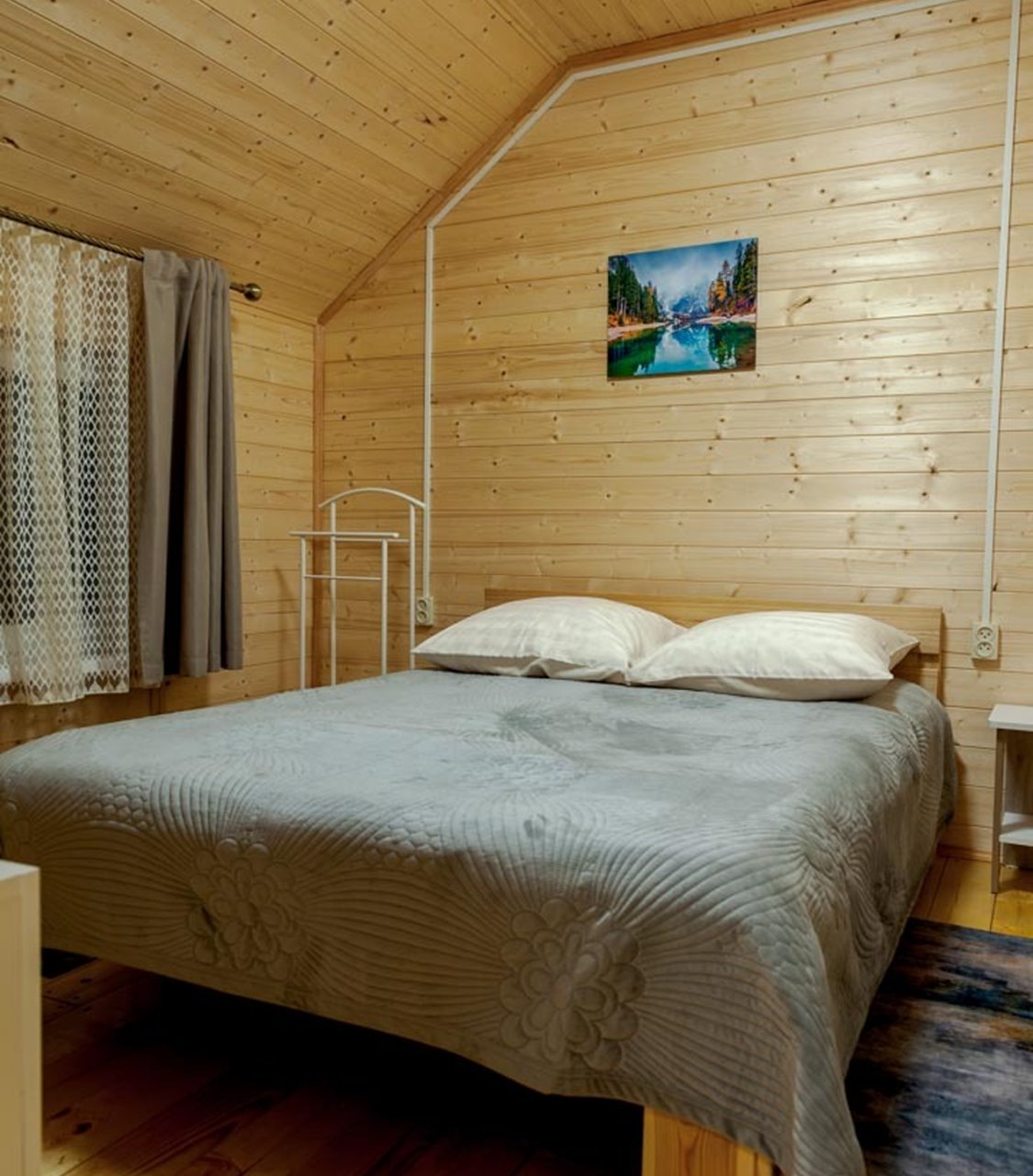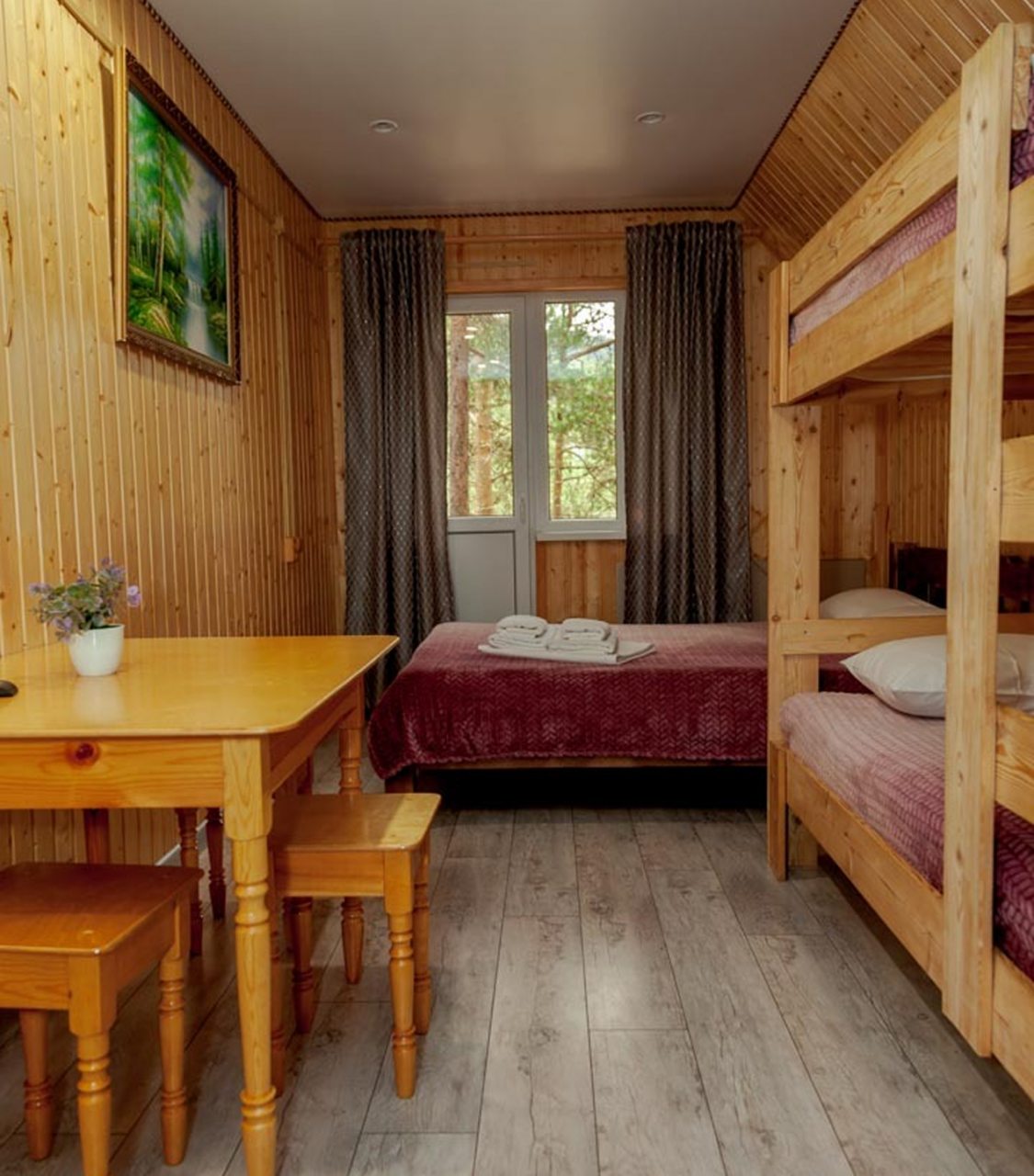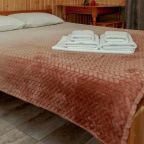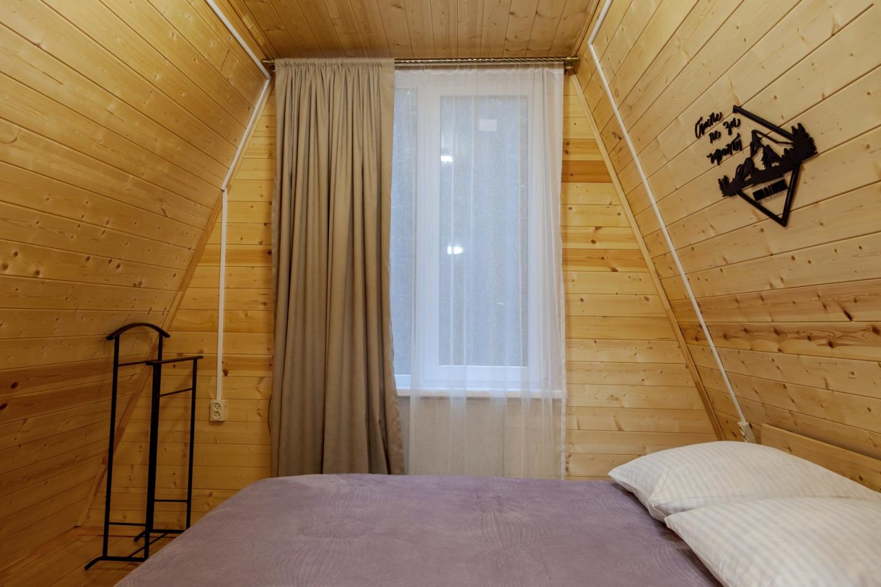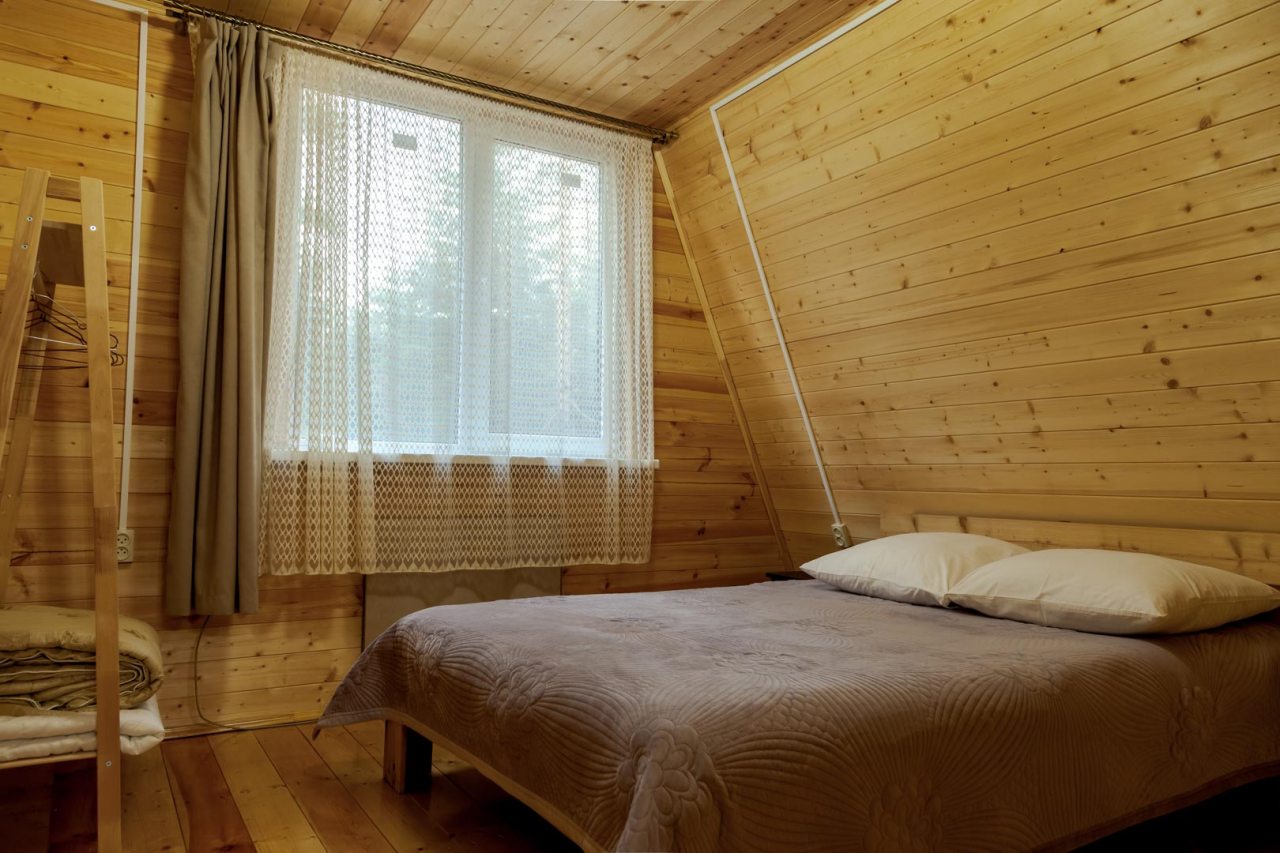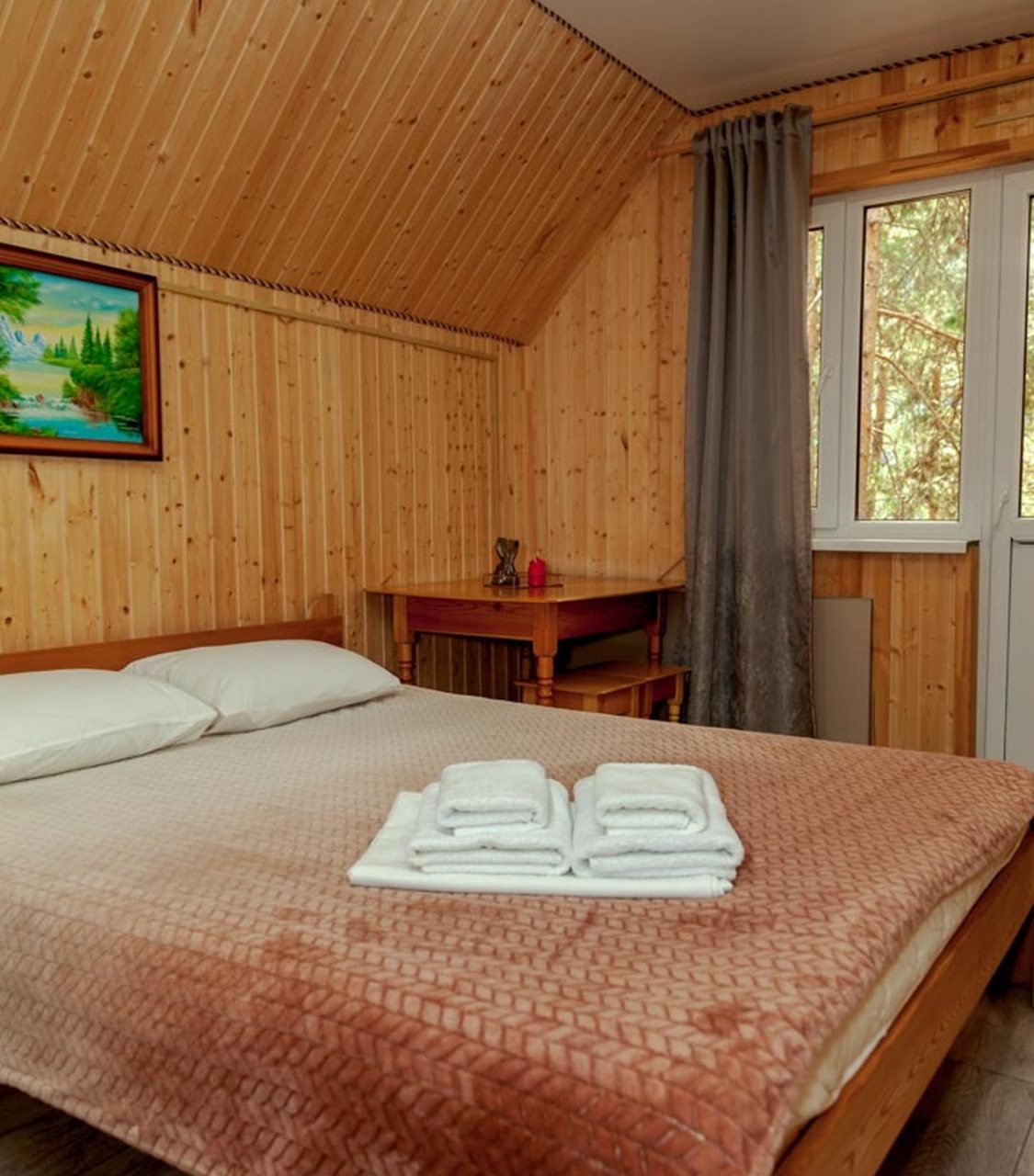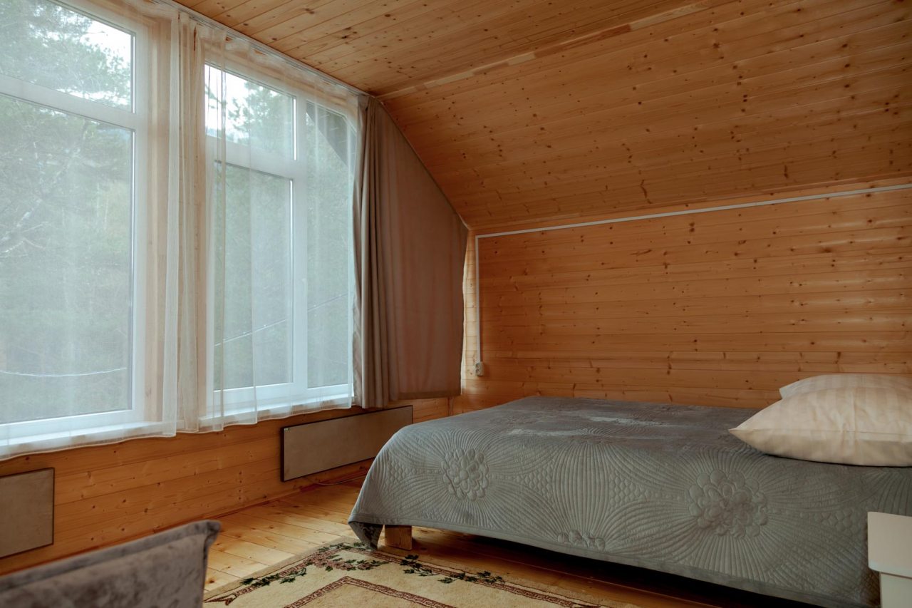 Неплохая база отдыха, новая, все с нуля, похоже. Благодаря этому постельное, полотенца все свежее, не застиранное. Обстановка в домике простая, ничего лишнего, есть кровати деревянные, стол с лавками, мебель, ванная. Готовить еду можно на открытом огне, на мангале. Кушать лучше на улице с видом на лес.