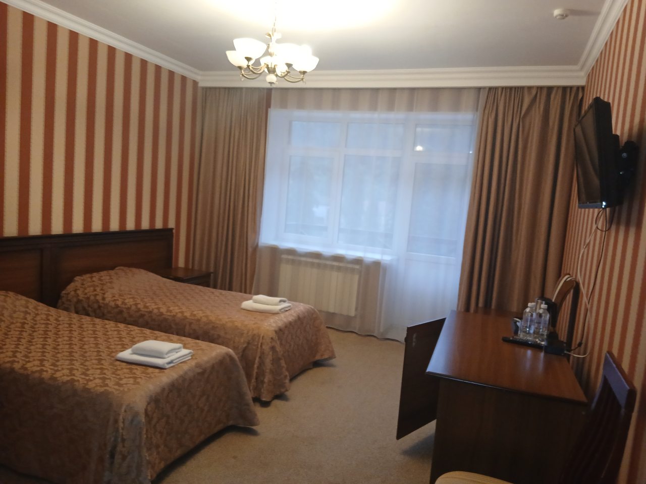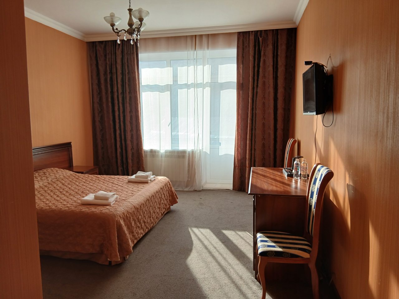 Здравствуйте, мы заказали номер эконом, но скажу сразу не делайте этого, во-первых окна практически нет, во-вторых отопление включают на ночь, мы заехали днём и было холодно, в-третьих ковёр под ногами в ужасно грязном состоянии, хотя когда-то был бежевым.Номер 224. Обратились к администратору и, доплатив переехали в номер 325. Это небо и земля по всем условиям . Отличный номер. Балкон , вид на горы , и.т.д. Разница в 3т.р. В остальном всё понравилось. Ресторан правда не работал, но работало кафе.( хычины и травяной чай)вкусный. Всем хорошего отдыха!!!!!