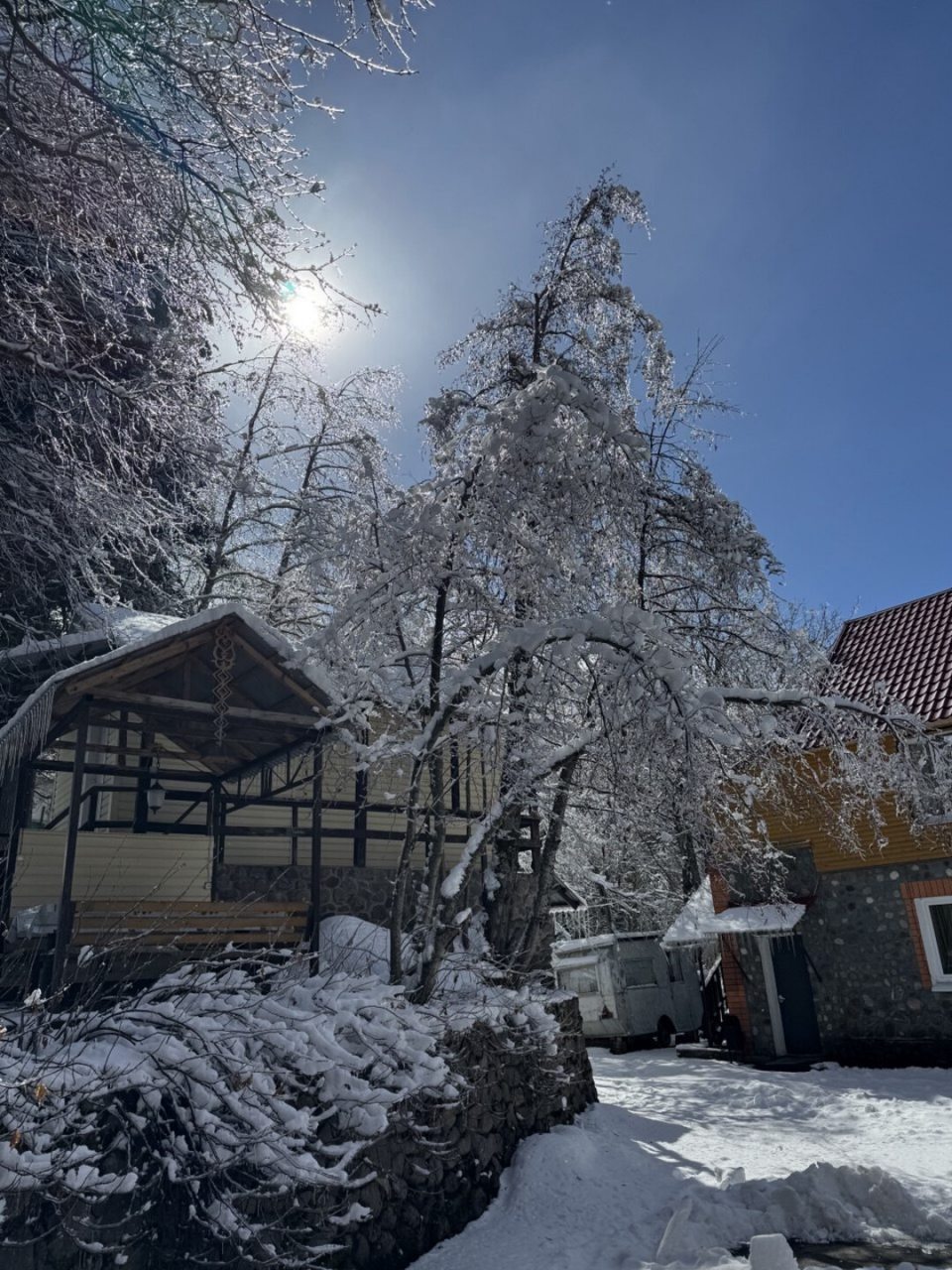 Приятно порадовали доступные цены на размещение, потому что отель находится в центре Домбая и совсем рядом с канатной дорогой, что самое главное в зимнем отдыхе. Номера тут скромненькие, но чистота соблюдается, за это спасибо внимательному персоналу. Питались мы в разных кафешах поблизости.
