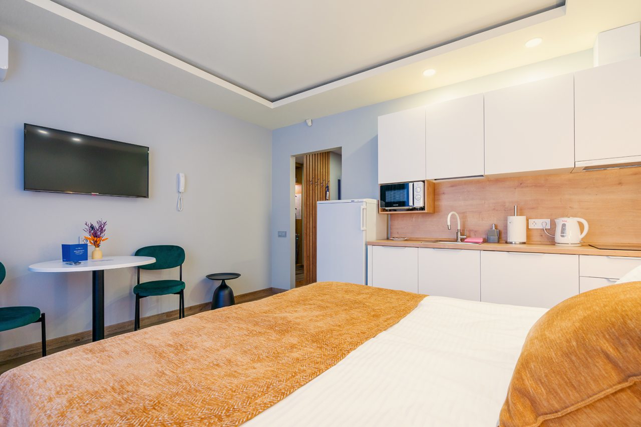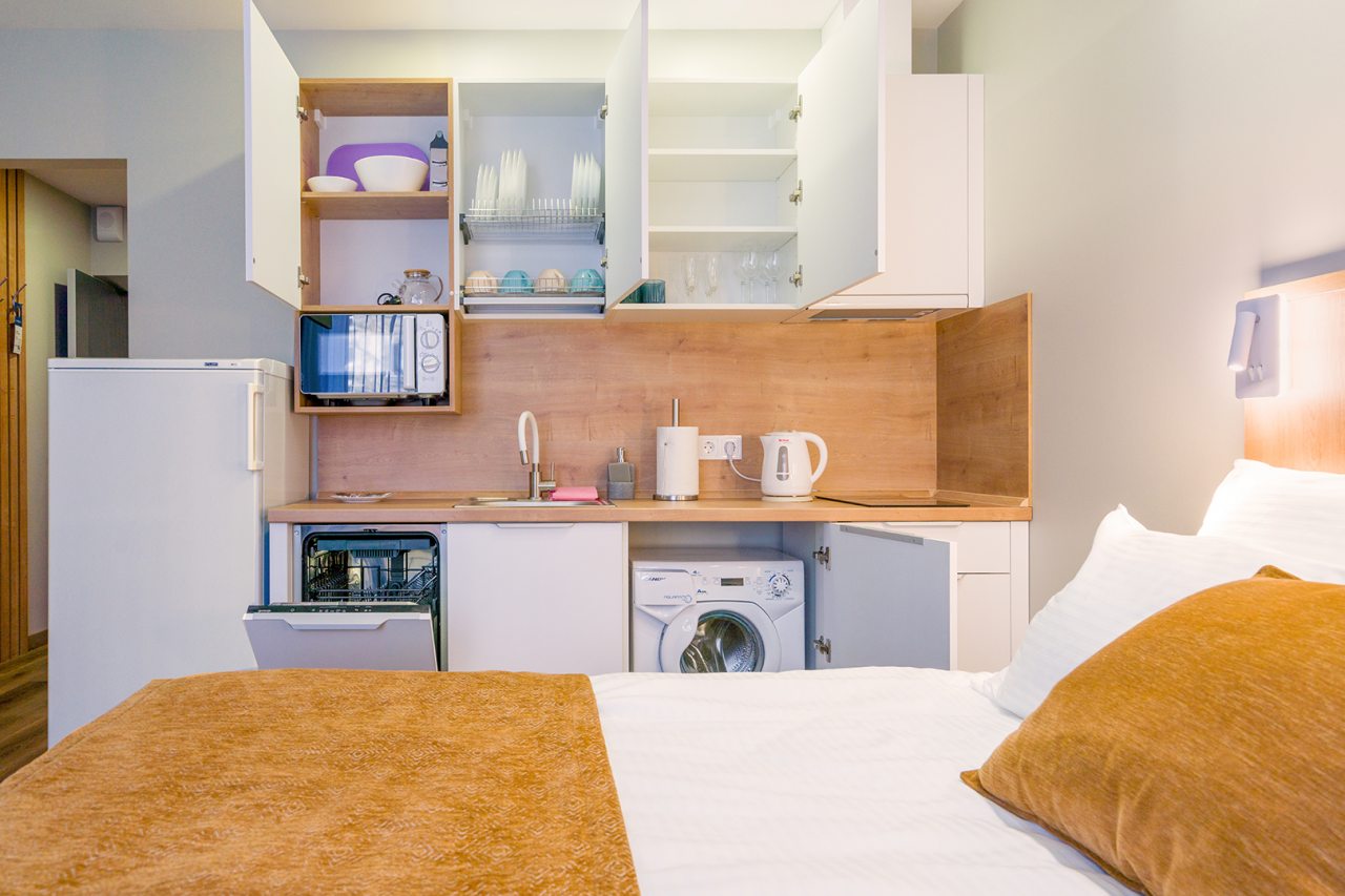Номер я назвал для себя все включено. Сейф, гладильная доска, утюг, сушилка, фен, огромное колличество полотенец, поноценная кухня с посудомойкой, стиралкой, индукционной варочной панелью, посудой на любой вкус вплоть до сковороды и кастрюльки,вытяжка над плитой, отличный телик с плаченным кинопоиском и кондиционер, очень продуманный и разнообразный свет. Огромный душ, не с пробниками а с полноценными бутылочками косметики Grass. Понятно дело вайфай. Также лежат капсула для машинки, таблетка для посудомойки, маленькие шоколадки и пакетики с вкусным чаем для подзарядки вас самих. Розеток куча, можно хоть всю видеотехнику съёмочной группы Киркорова зарядить одновременного. Вообщем полноценная квартира что об не только спать но и привести себя, одежду в порядок, полноценно приготовить поесть. Под конец ещё и электрополотенцесушитель с сенсорным управлением нашёл, благодаря ему, утеплённая джинсовая куртка высохла за ночь, месте с джинсами. Вообщем я впервые вижу такую продуманность в гостинице и внимание к деталям и мелочам. После суток всяких перелётов и переездов можно восстановиться и жить дальше с удовольтвием. И да суперский текстиль, от полотенец до штор, не массмаркет это точно, прям серьезные интерьерные ткани. В общем огромное спасибо и раз что выбрал именно вас.