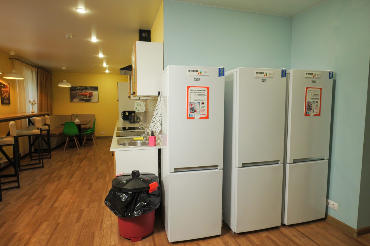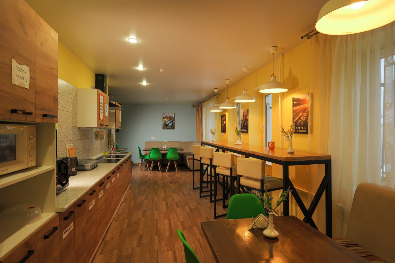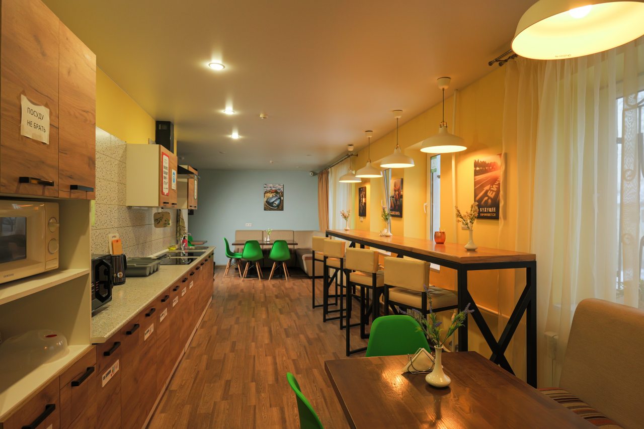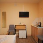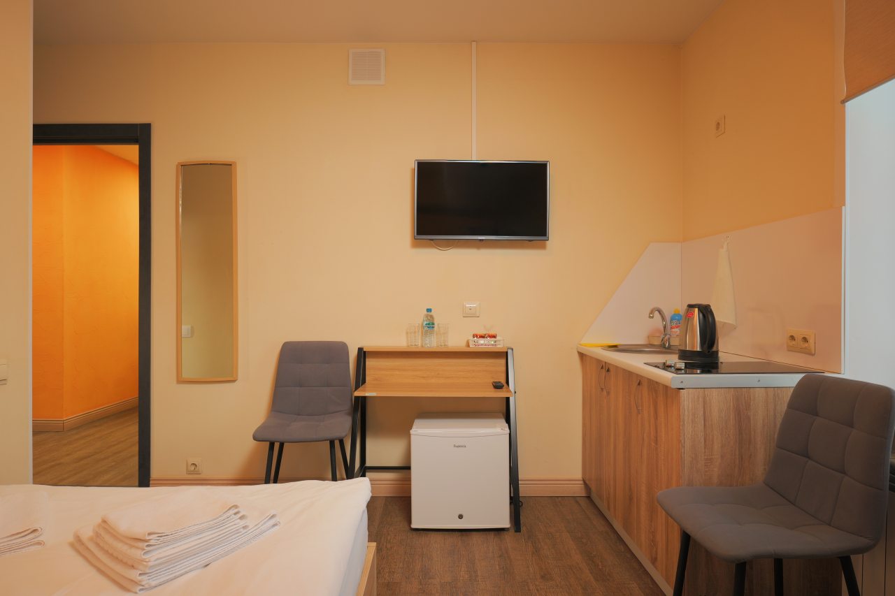 Мы приехали поздно ночью. Несмотря на это, нас приветливо встретили на ресепшен, показали номер, кухню. Номер хоть и небольшой, но очень уютный и чистенький. В санузле и кухне тоже очень чисто. Кухня вообще напоминает мини кафе. Мы путешествовали с котом. За его размещение доплатили 500 руб. Ему вроде тоже понравилось)