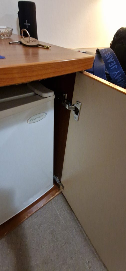 Из недостатков: дверка на тумбоче с холодильником держалась на одной петле и оставленные кроссовки от предыдущих жильцов в тумбочке.