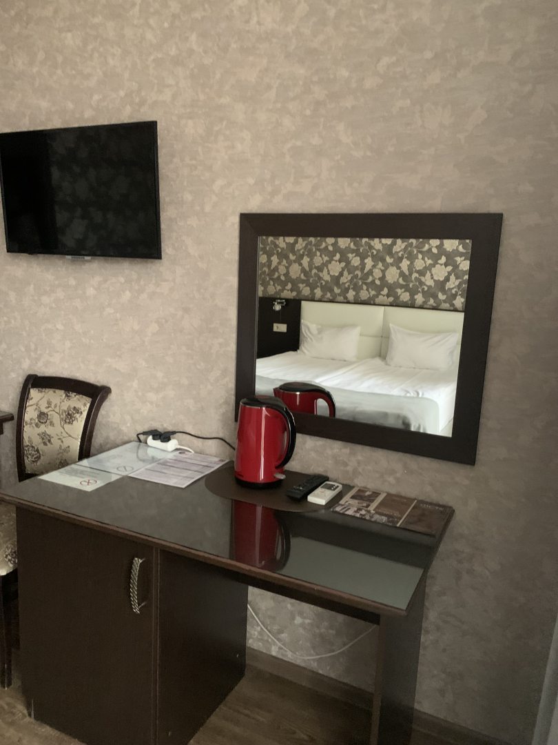 Все чисто, отель в самом центре, до источников 5 минут. Вокзал рядом. В номере чай, кофе. Чайник, посуда ( кружки, тарелки, столовые приборы), фен, халаты, холодильник. Рядом с отелем есть рынок.