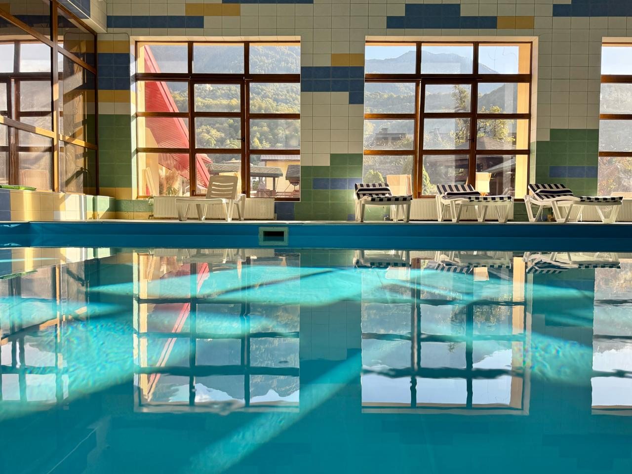Открывается с территории красивый вид на горы. Есть крытый бассейн. Ремонт весьма неплох. Стоимость очень приятная. Даже в номерах эконом все очень хорошо и удобно. В санузле все чисто, сантехника выглядит новой. На территории есть столики, место для отдыха, прогулок. Территория огорожена, машин не слышно.