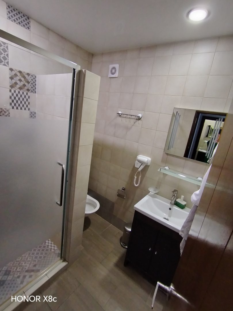Очень хорошее расположение. Всё в шаговой доступности. Территория своя, хорошо оформлено. Чисто в номере. Смена полотенец и белья на 5+. Вежливый персонал.