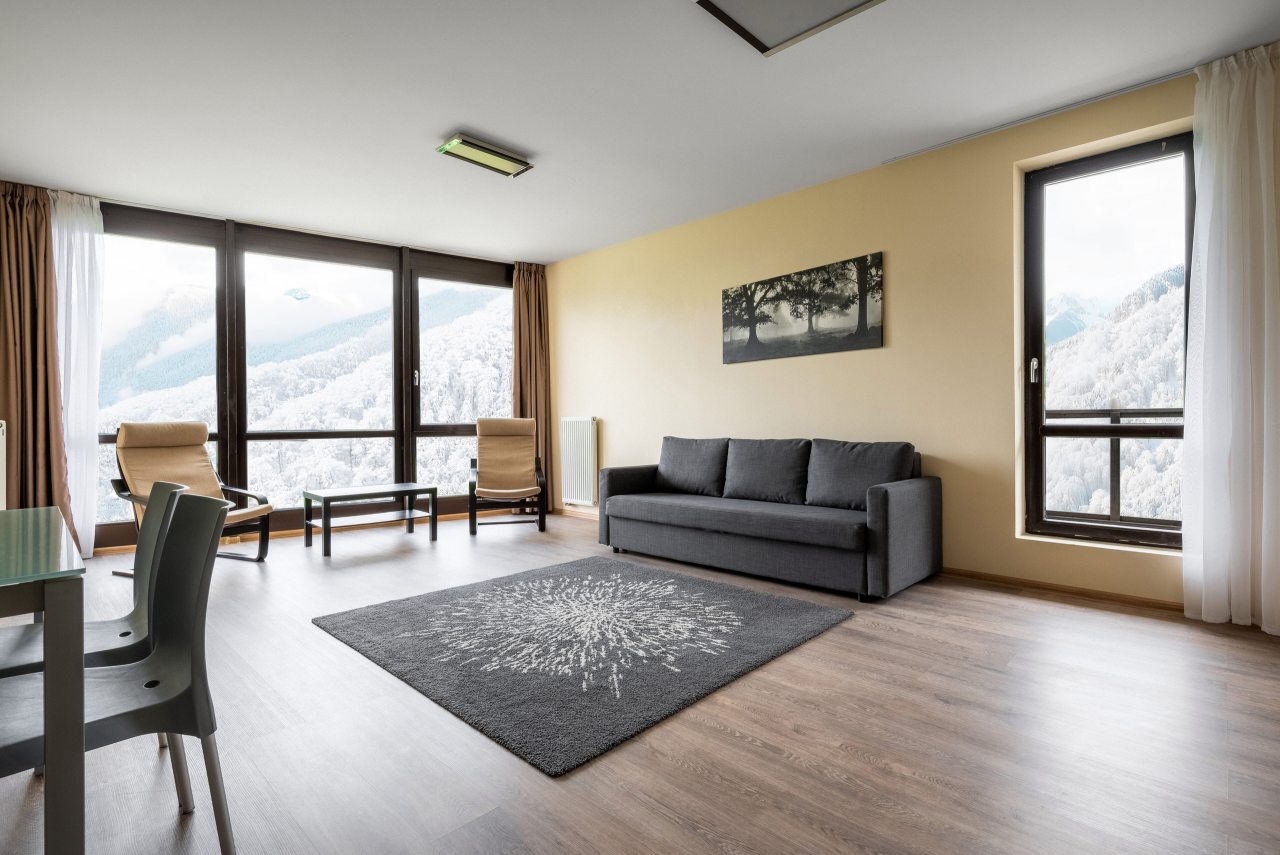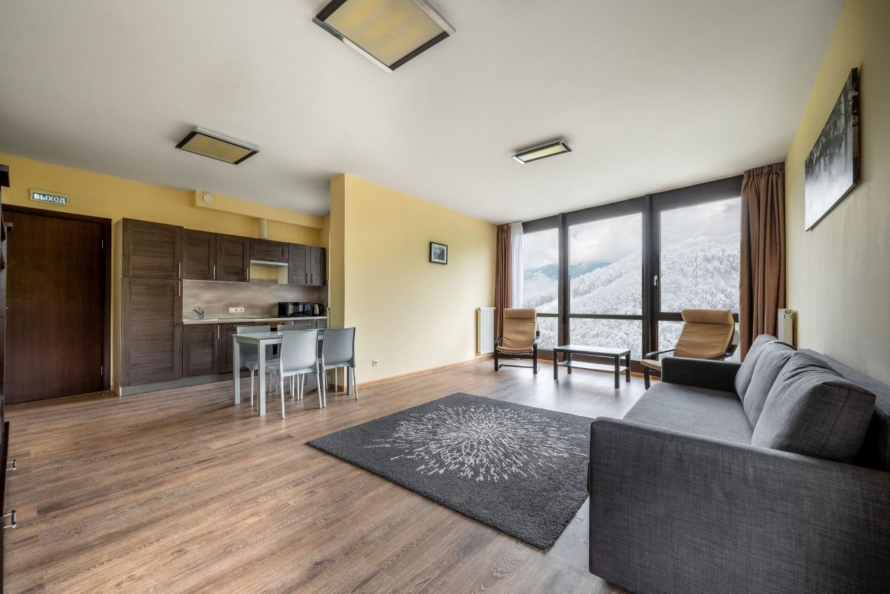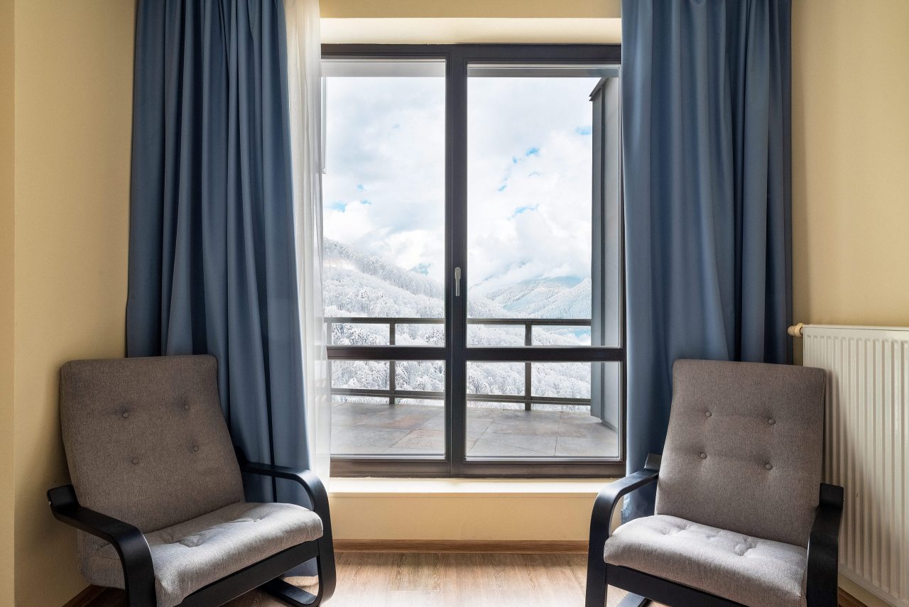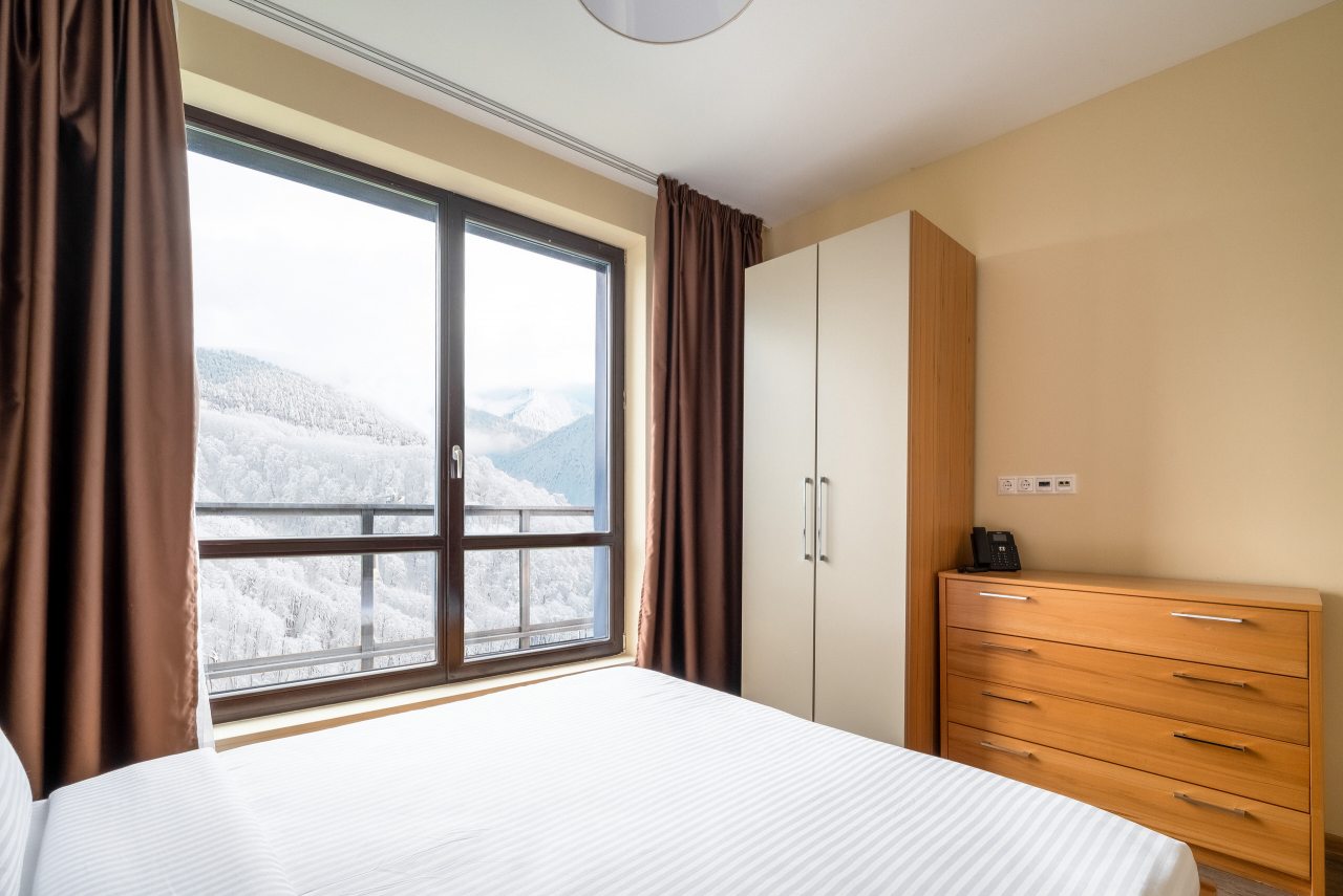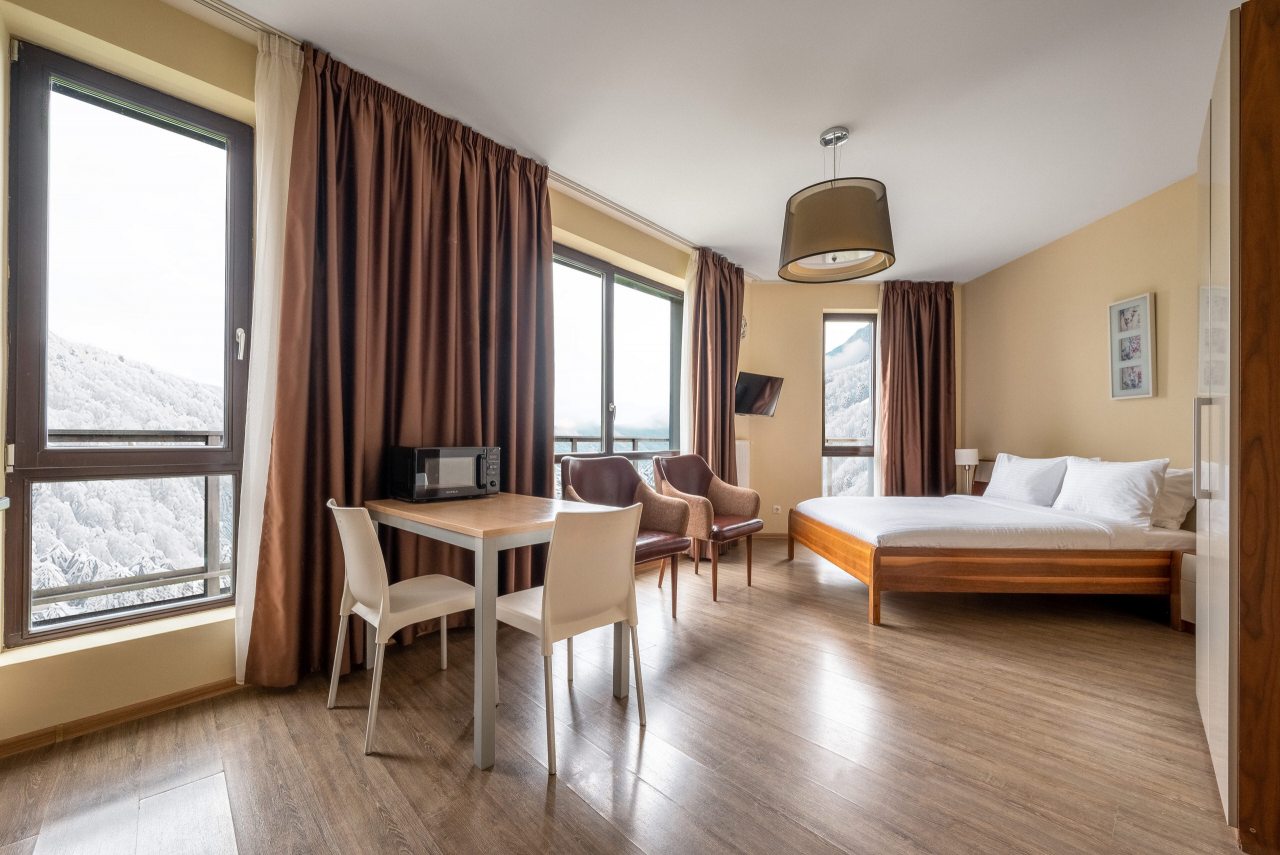 Очень просторный номер и очень удобная планировка. Шйкарный вих на горы и подъемник, именно то что я искала. До розы Хутор и назад ездит шаттл каждый час туда, и обратно. Вежливый персонал хороший расторан+ наличие парковки.