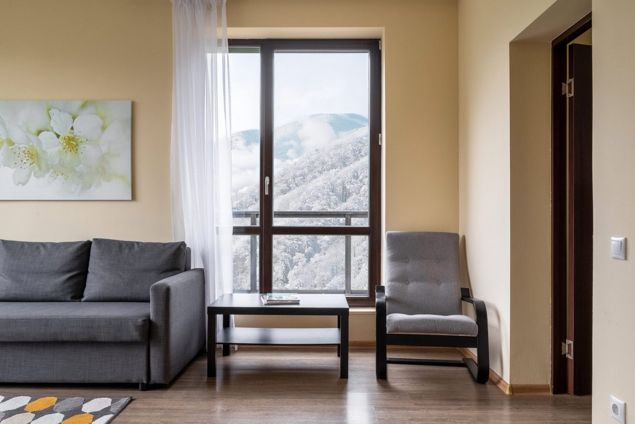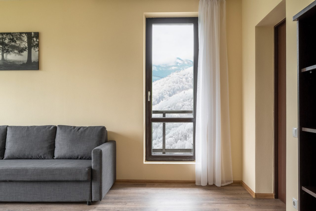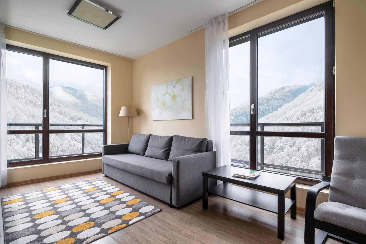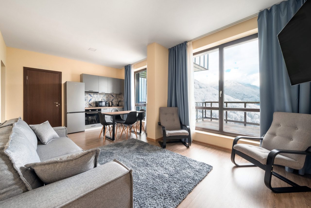 Очень просторный номер и очень удобная планировка. Шйкарный вих на горы и подъемник, именно то что я искала. До розы Хутор и назад ездит шаттл каждый час туда, и обратно. Вежливый персонал хороший расторан+ наличие парковки.
