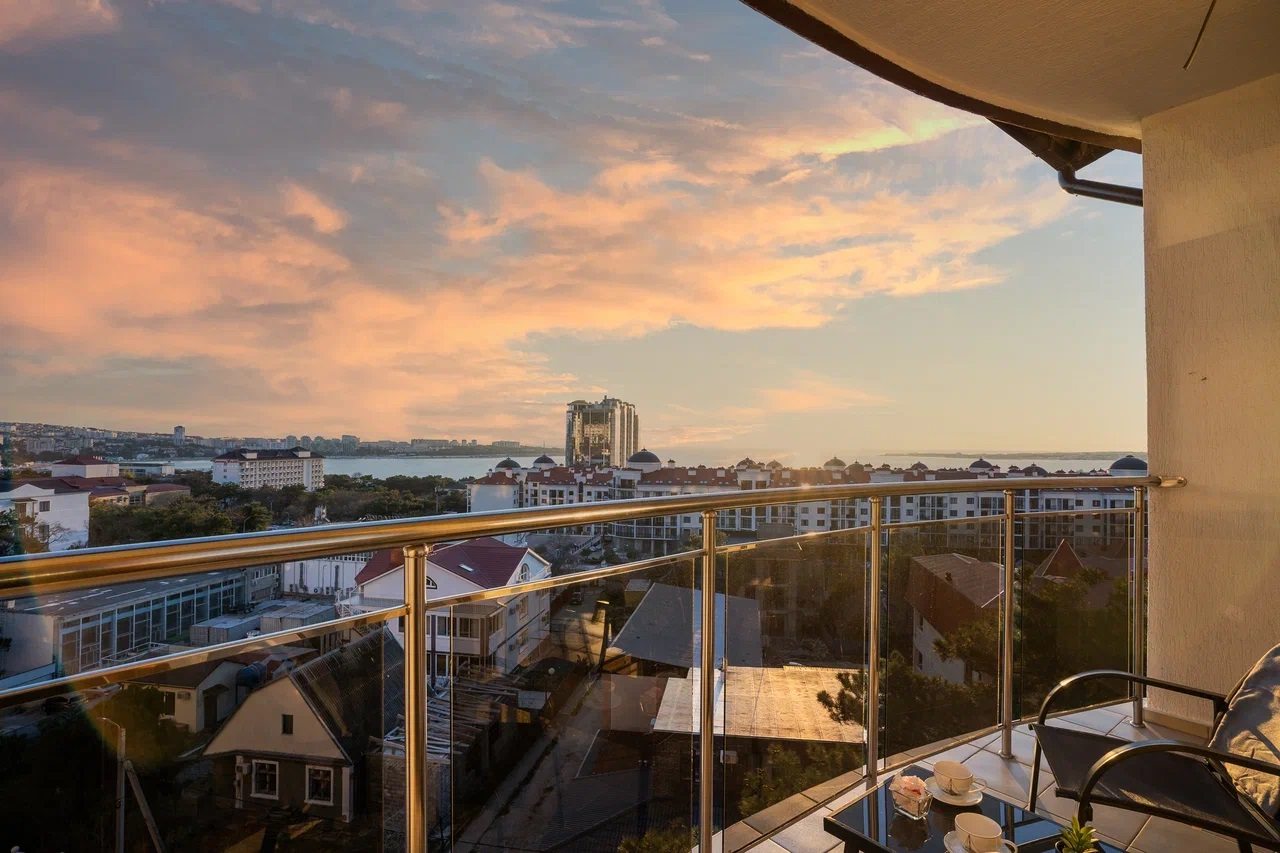 Красивое и стильное здание с подсветкой мы увидели еще издалека. Поэтому сразу просто влюбились. И после размещения тоже не разочаровались, а лишь только усилили первое впечатление. Чего стоит только балкон! Он не только сам прекрасно оформлен, сохраняя единый стиль общего здания, но и открываются с него сногсшибательные морские пейзажи.
