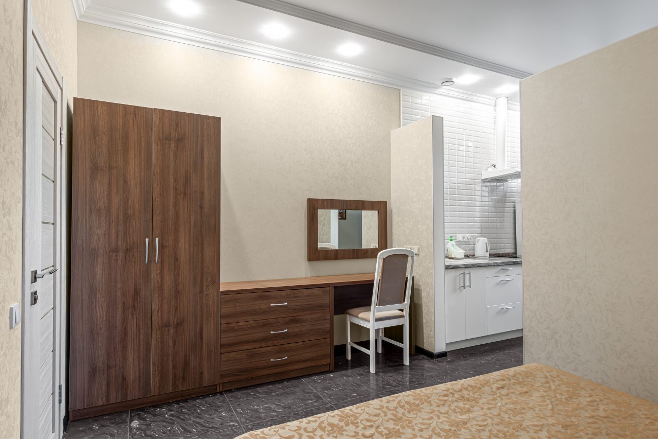В номере есть вся мебель. Целая, не затертая. Приятно пользоваться вполне! Есть своя душевая с туалетом. Чисто, средства гигиены присутствуют. У нас в номере была своя кухня. Не то чтобы мы много готовили, но пригодилась для хранения продуктов и бутербродов. В общем, весь приятное место, мне оно было по душе.